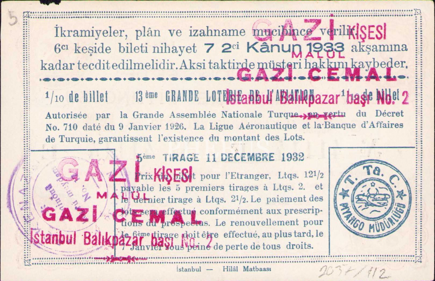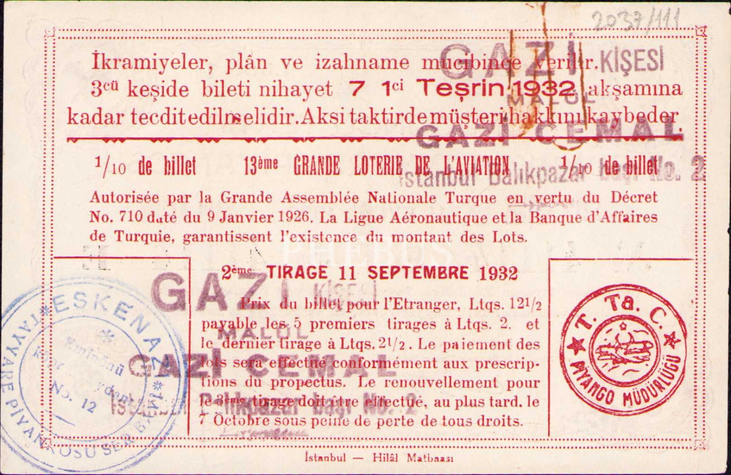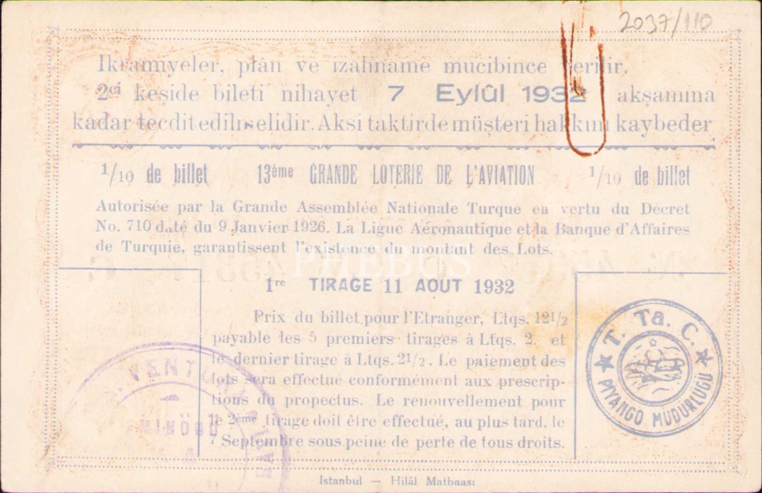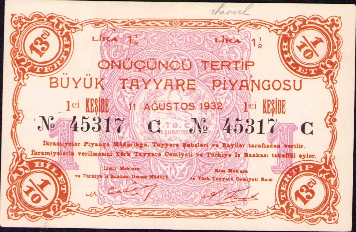 Onüçüncü Tertip Büyük Tayyare Piyangosu, 1. Keşide, 11 Ağustos 1932, 1/10 Bilet, C