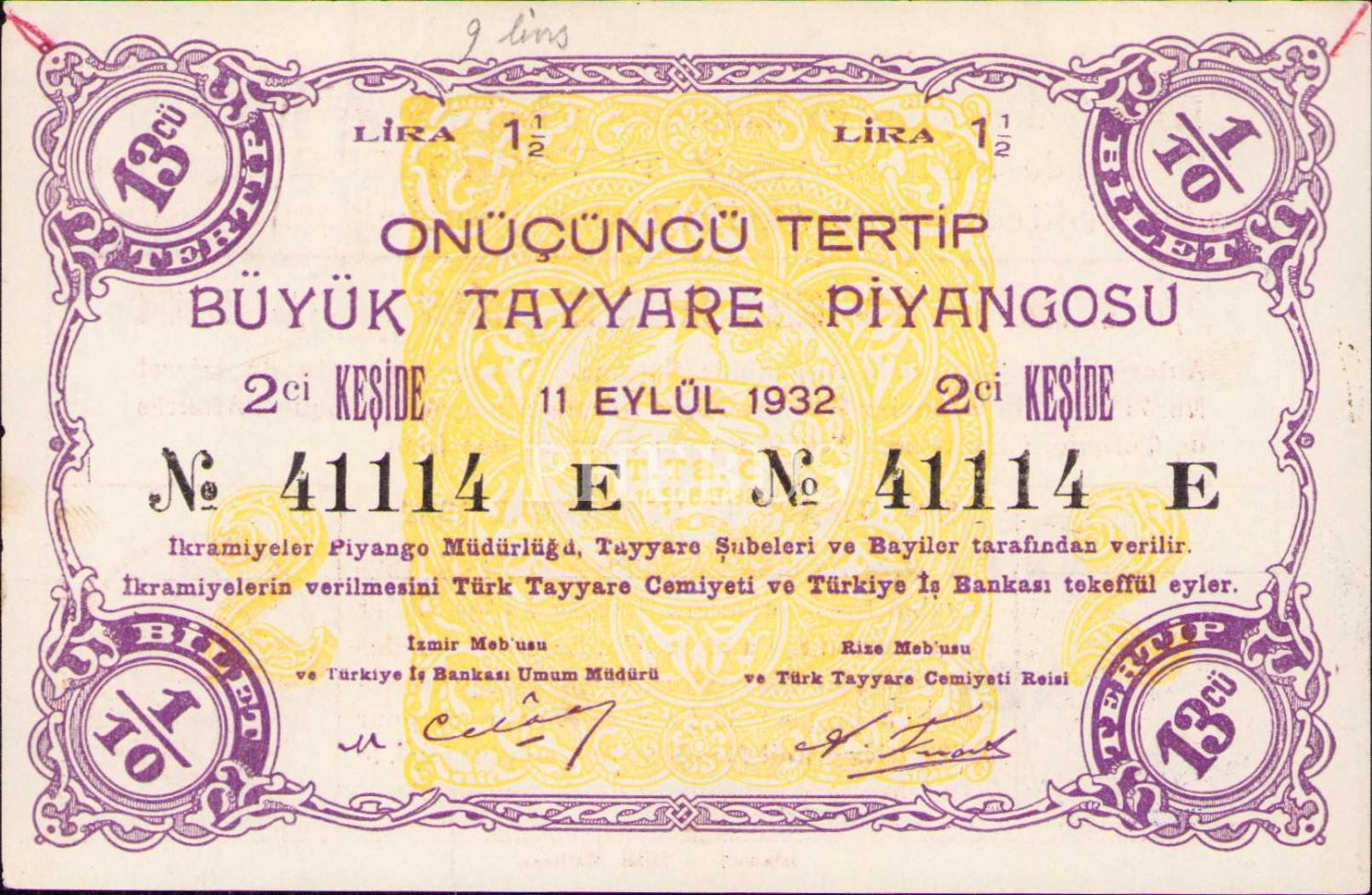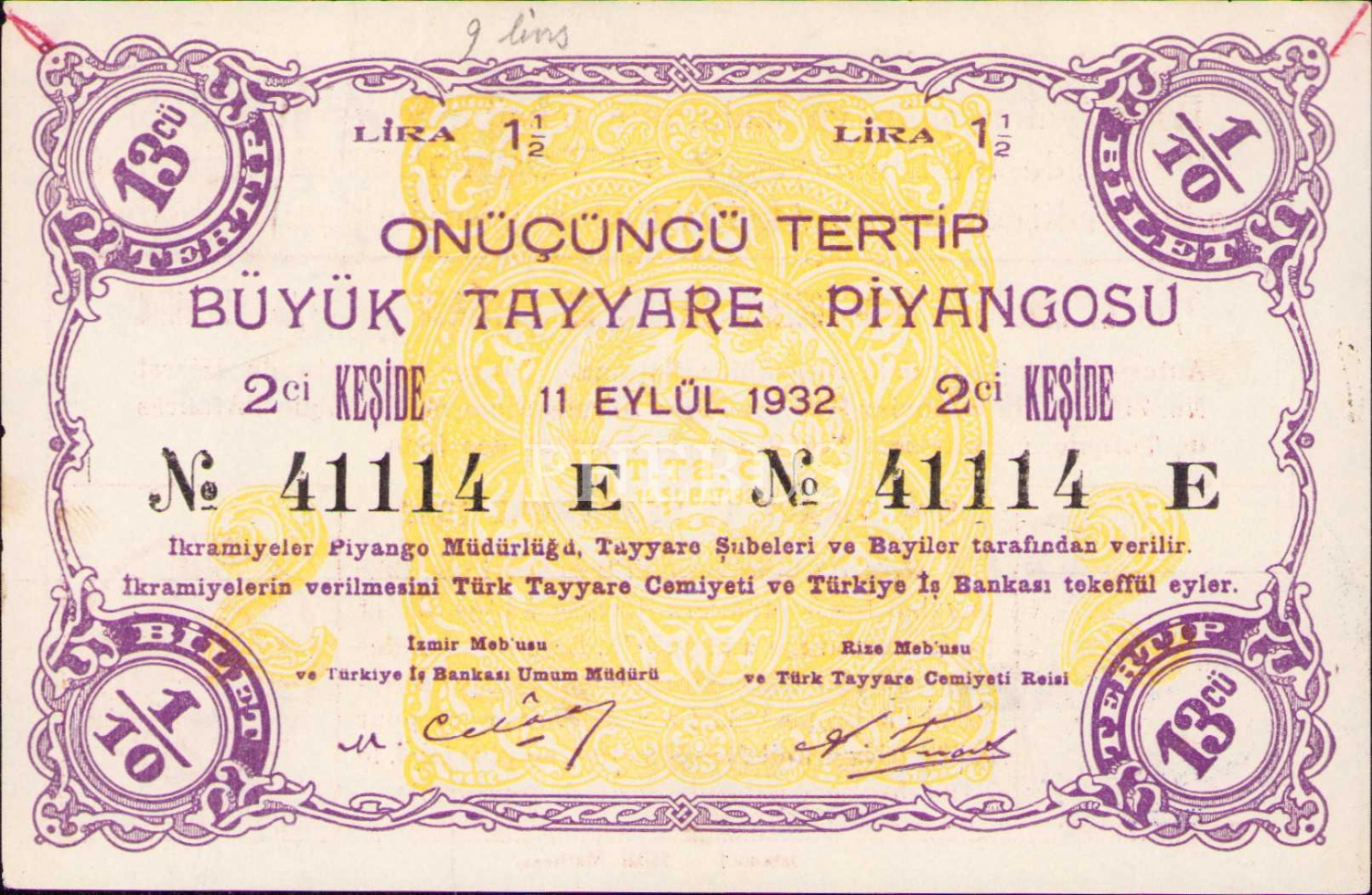 Onüçüncü Tertip Büyük Tayyare Piyangosu, 2. Keşide, 11 Eylül 1932, 1/10 Bilet, E