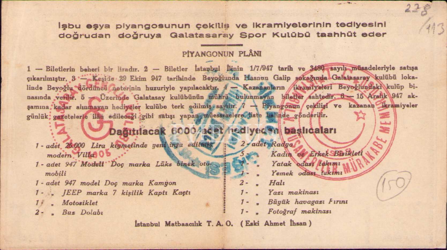 Galatasaray Kulübü Eşya Piyangosu, 29 Ekim 1947