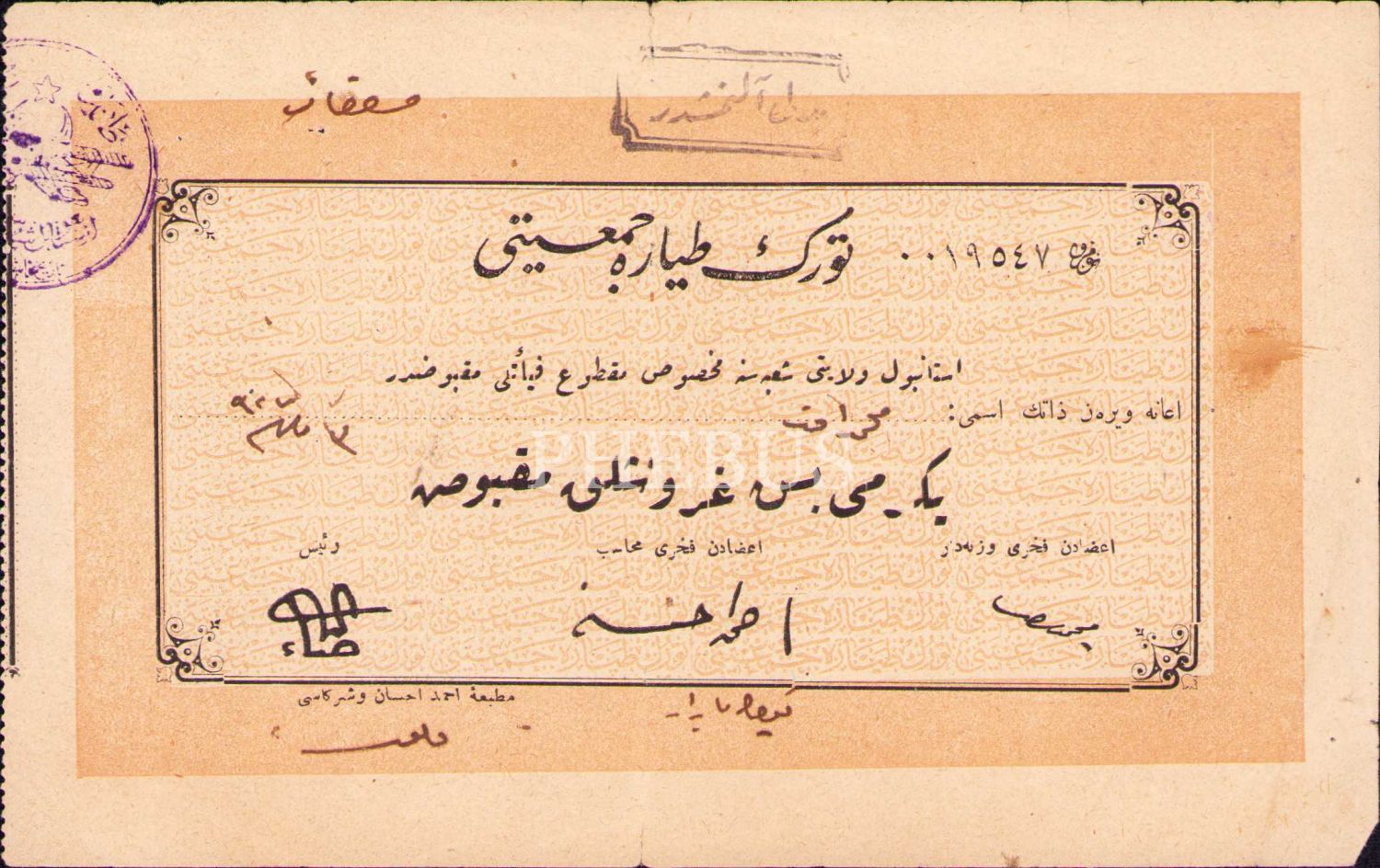 Osmanlıca Türk Tayyare Cemiyeti Makbuzu, 1927