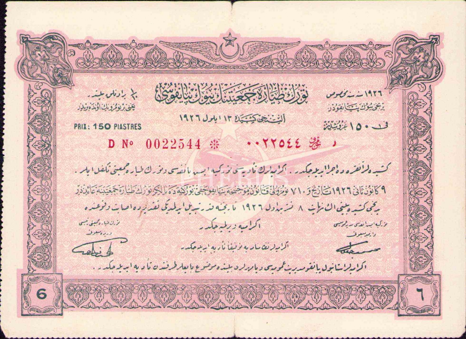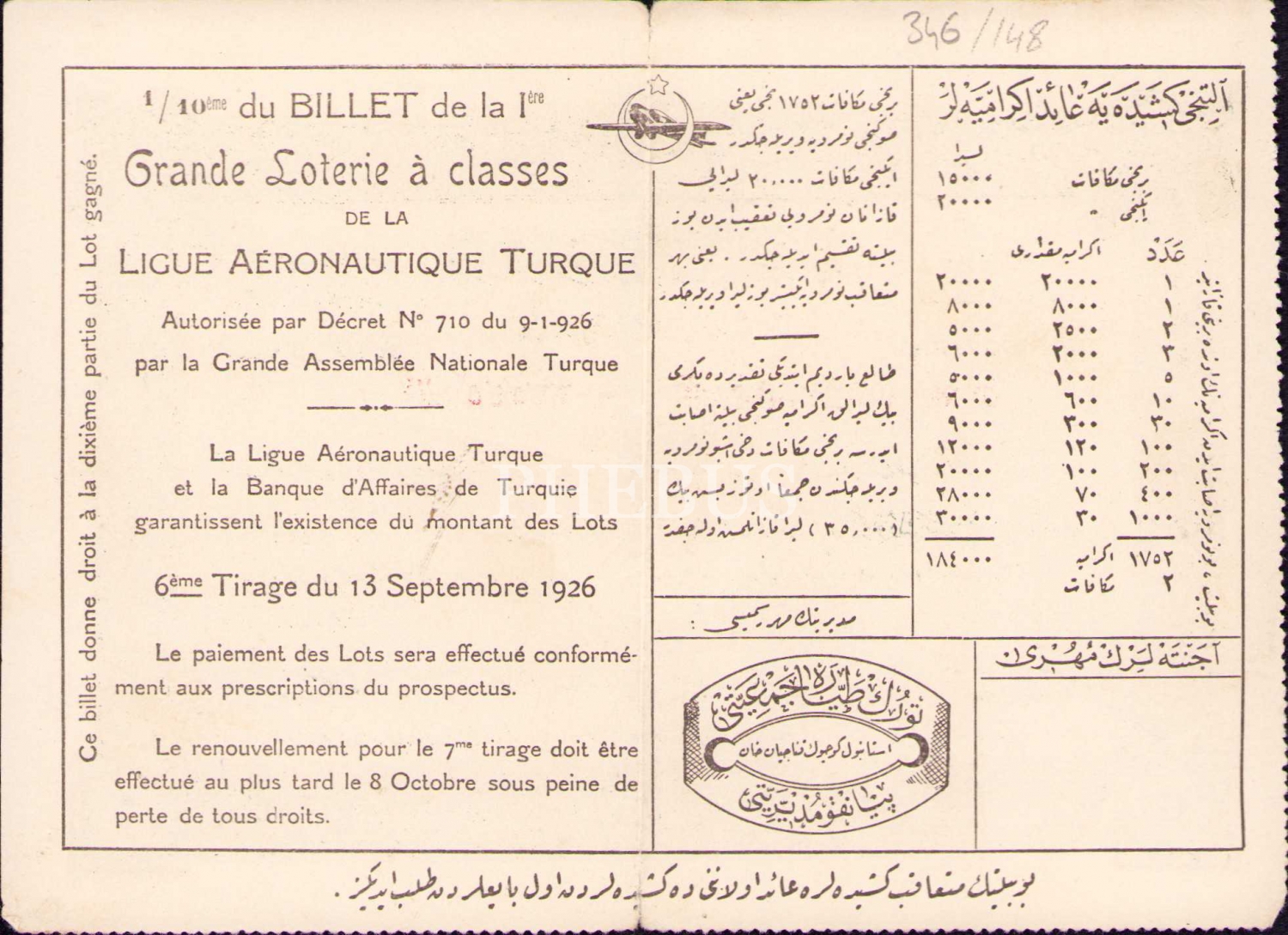 Osmanlıca Türk Tayyare Cemiyeti Büyük Piyangosu, 13 Eylül 1926, 1/10 Bilet, D