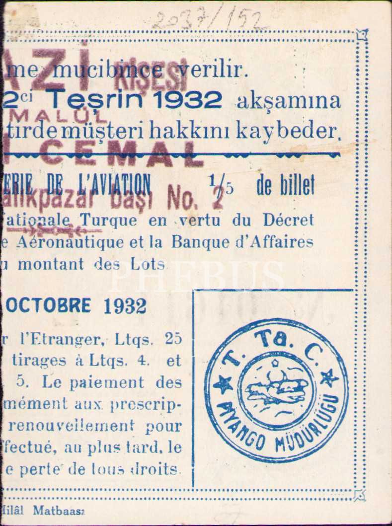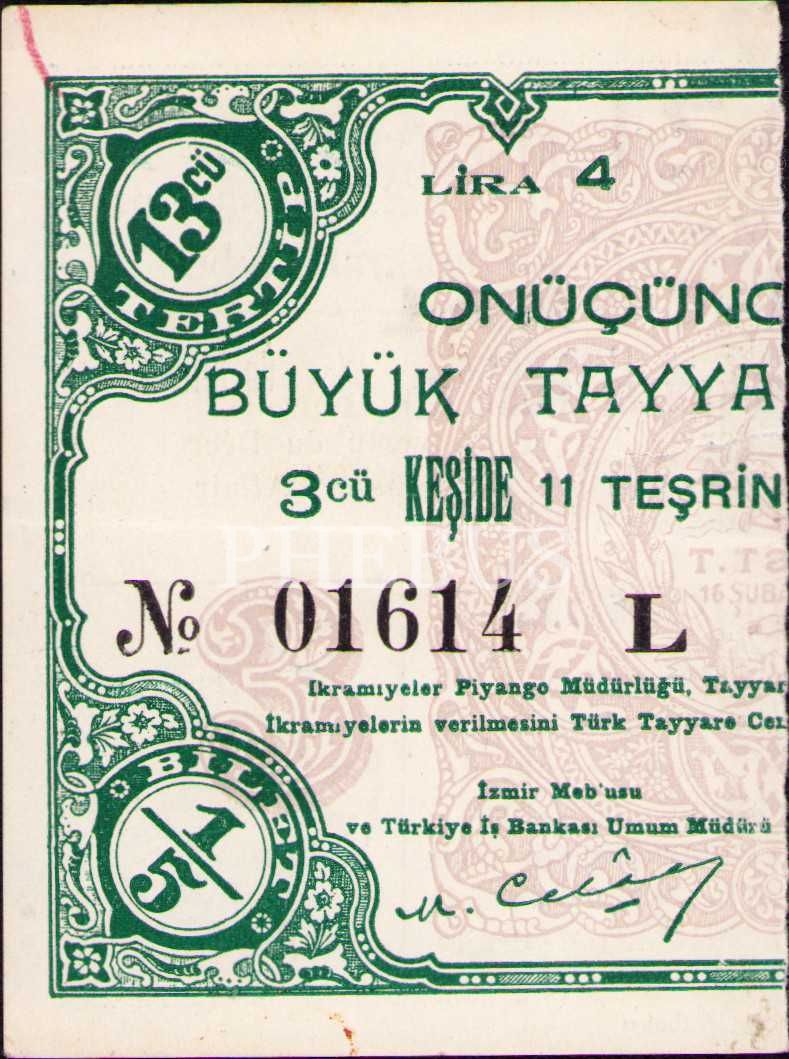 Onüçüncü Tertip Büyük Tayyare Piyangosu, 3. Keşide, 1/5 Bilet, L Kesik Halde