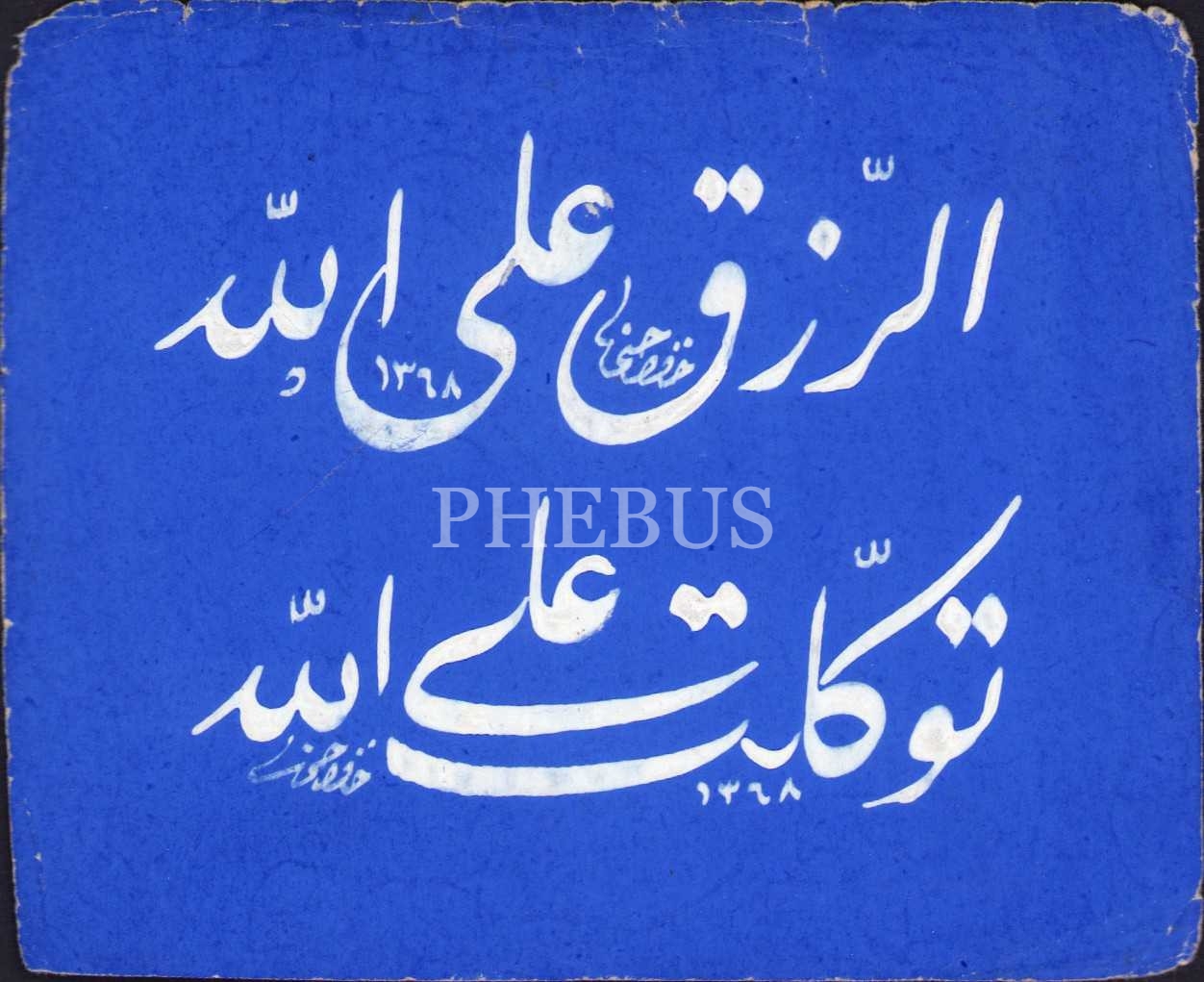 Ta'lik Yazı, "er-Rızku alâ Allah [Rızık, Allah'tandır]" ve "Tevekkeltü alâ Allah [Allah'a güvenip dayandım]", Hâfız Hüsnü ketebeli, 1368 târihli, kenarları yıpranmış hâliyle, 10x9 cm