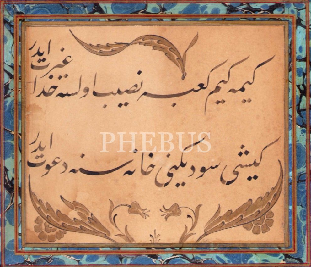 Ta'lik Beyit, 'Kime kim Kâbe nasib olsa Hudâ gayret eder/ Kişi sevdiğini hanesine davet eder", ebrulu, Hattat Halim Özyazıcı terekesinden, 12x15 cm.
