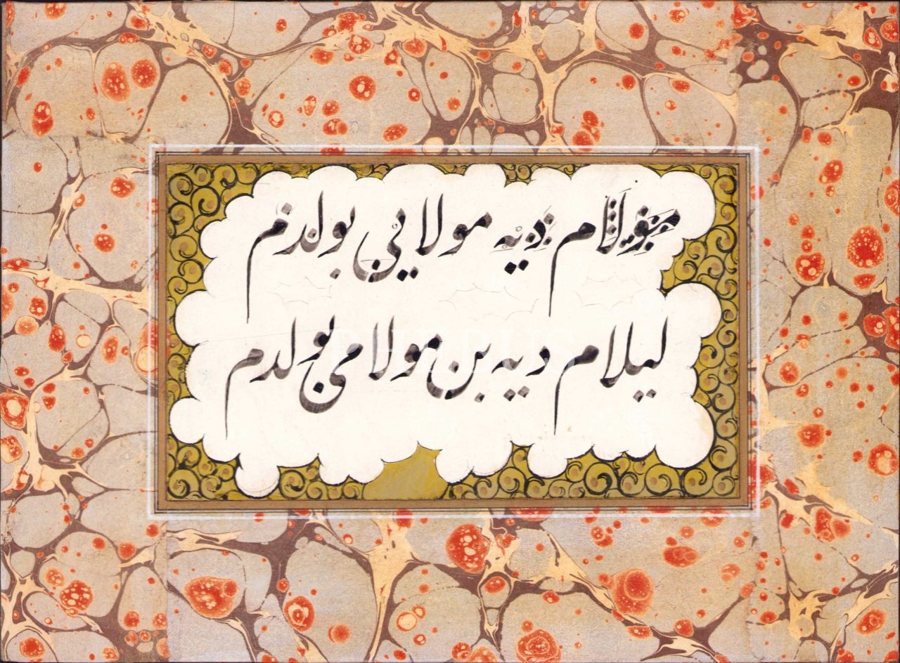 Ta'lik Beyit, "Mevlâm diye ben Mevlâ'yı buldum/ Leylâ'm diye ben Mevlâ'yı buldum", ebrulu, Hattat Halim Özyazıcı terekesinden, 15x9 cm