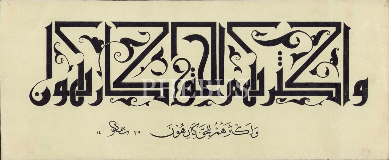 Çiçekli Kûfî Ayet-i Kerime, Müminun Suresi 70. Ayet: "[İnsanların] çoğu hakikatten hoşlanmaz", Said ketebeli, 1429 târihli, 35x15 cm