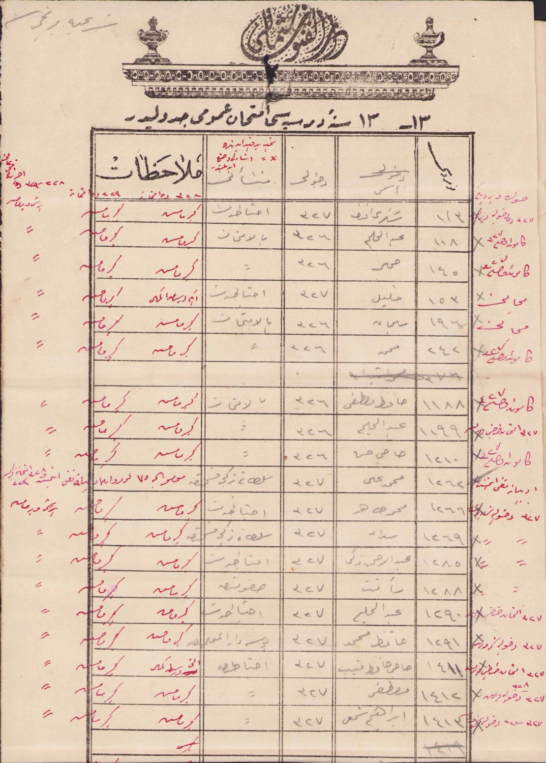 Darülfünun Osmanlı imtihanı umumiye cetveli, 20x57cm