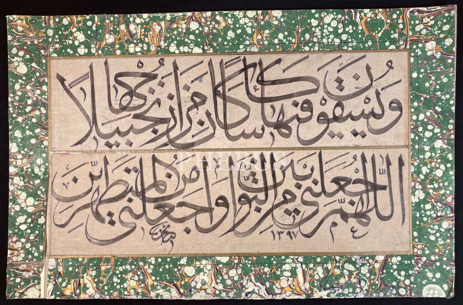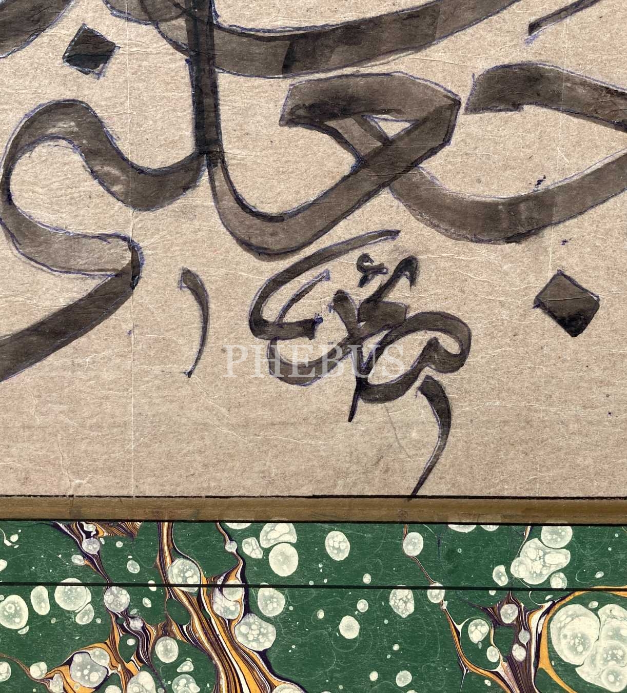 Celî Sülüs Levha, İnsan Suresi 17. Ayet, "Orada [Cennette] katkısı zencefil olan kaseler sunulur", "Allahım beni tevbe eden ve temizlenenlerden eyle", Saim Özel ketebeli, 1397 tarihli, ebrulu, 57x31 cm