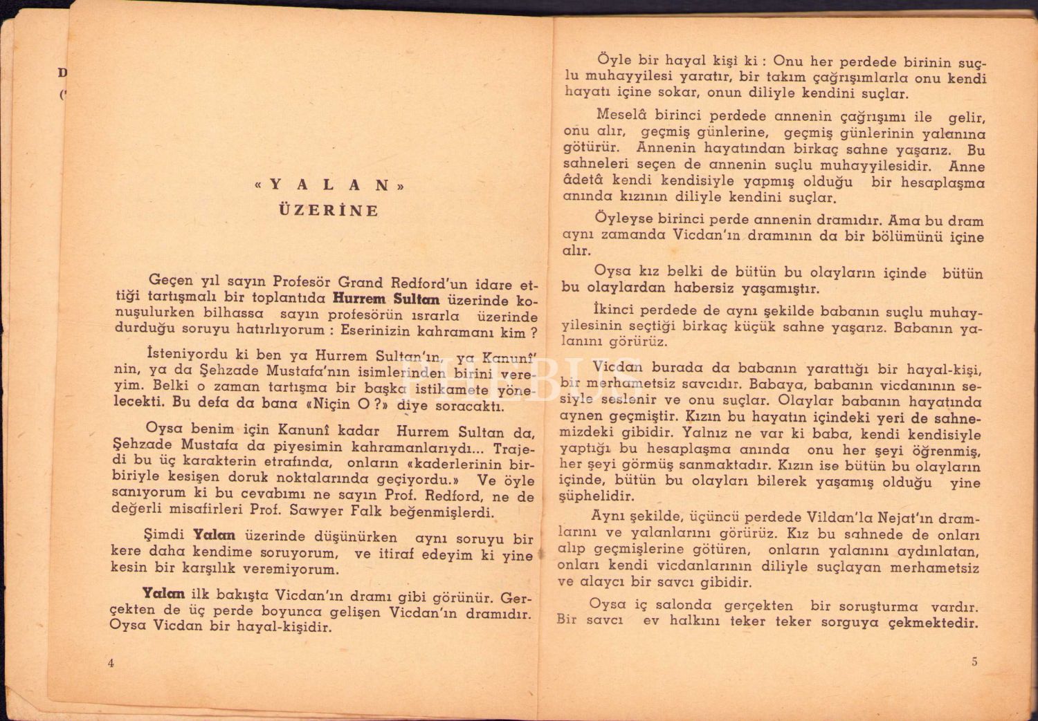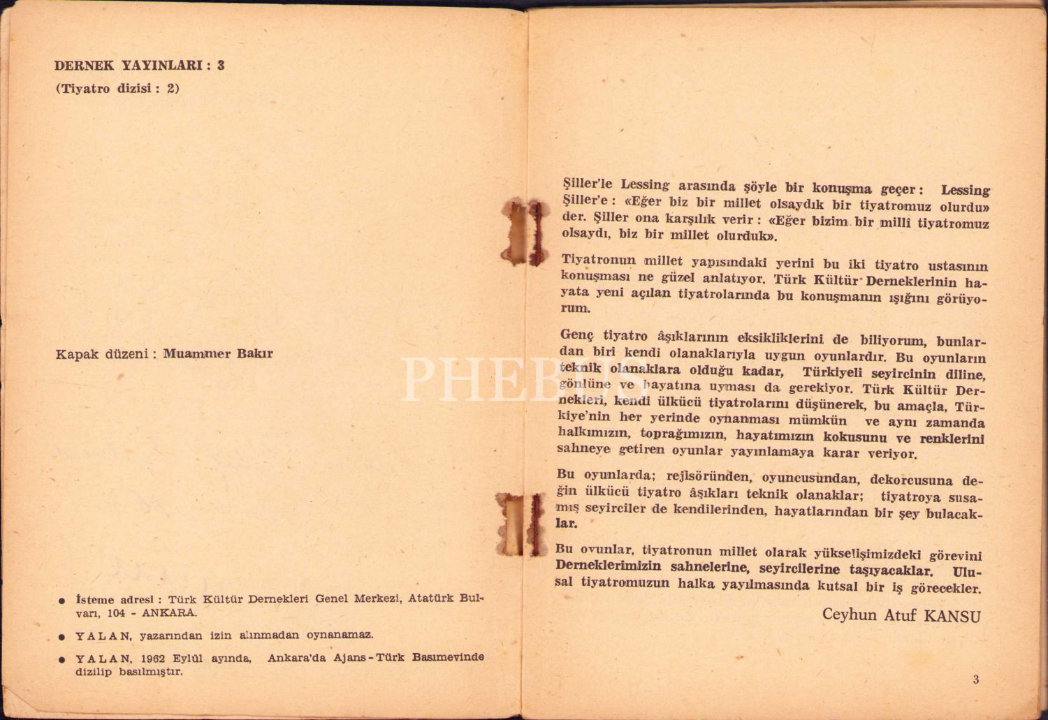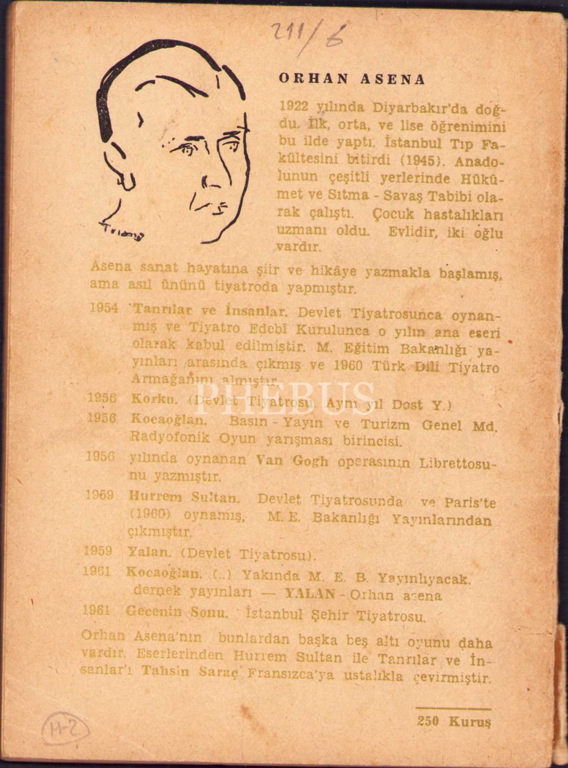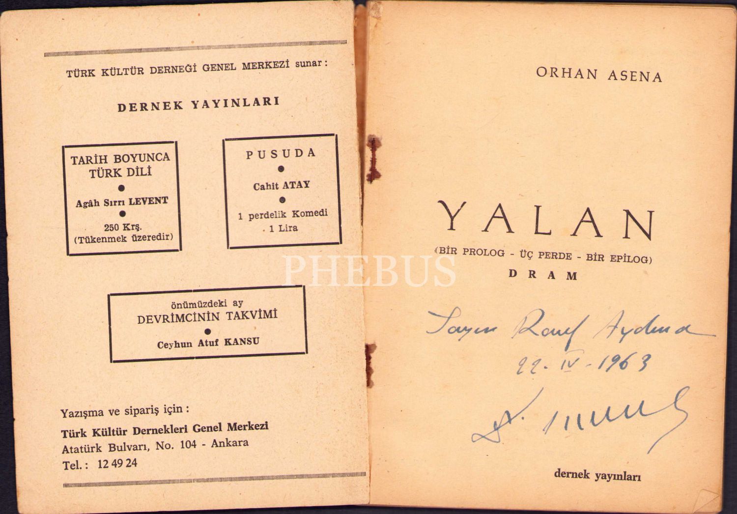 Şair ve Oyun Yazarı Orhan Asena'dan İthaflı ve İmzalı "Yalan -Tiyatro Eseri-" İlk Baskı, Dernek Yayınları, 1962, 76 sayfa, kitap sırtı yıpranmış hâliyle, 12x16 cm