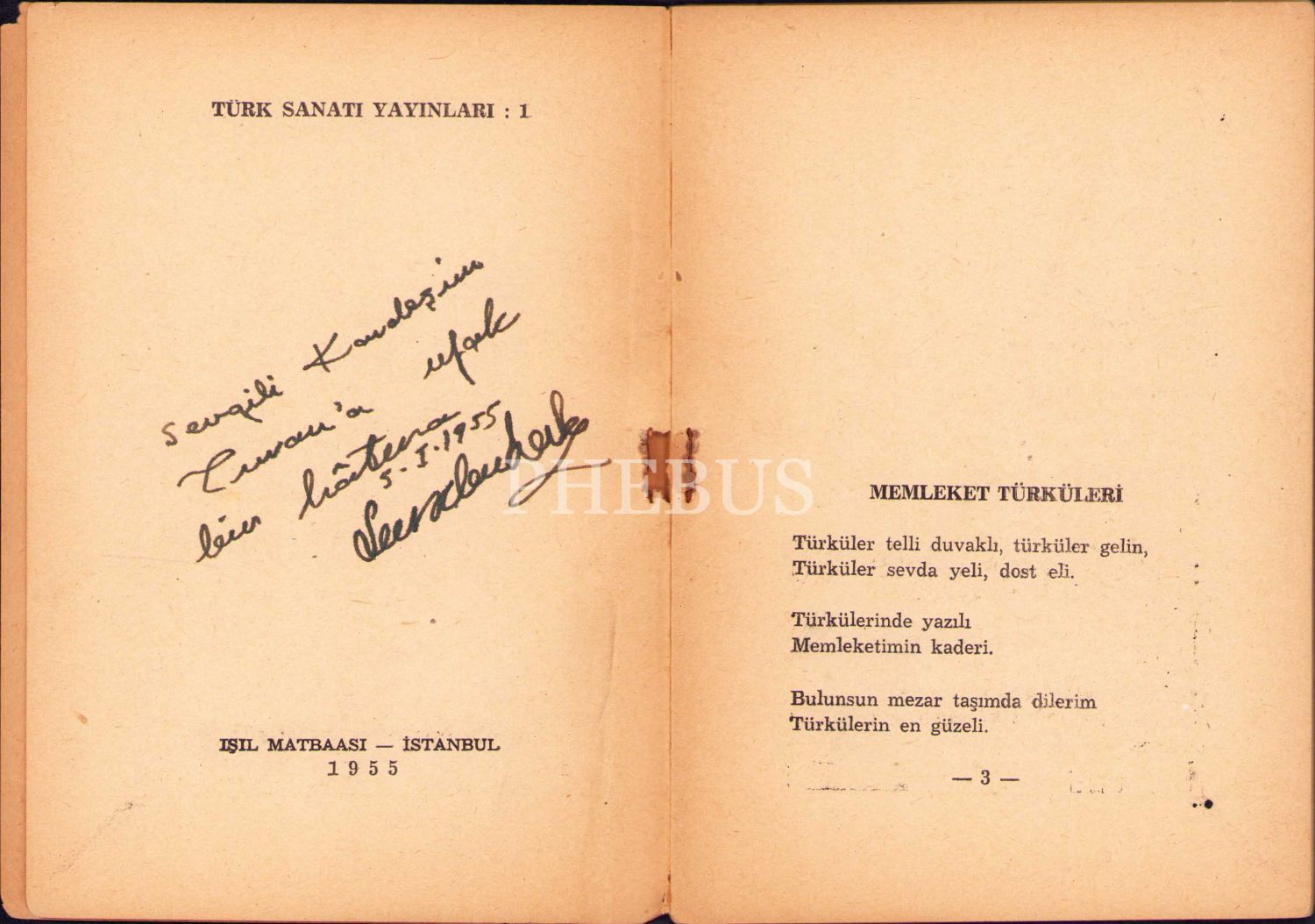 İthaf, "Sevgili Kardeşim Turan'a ufak bir hatıra, 5.I.1955" şeklindedir.