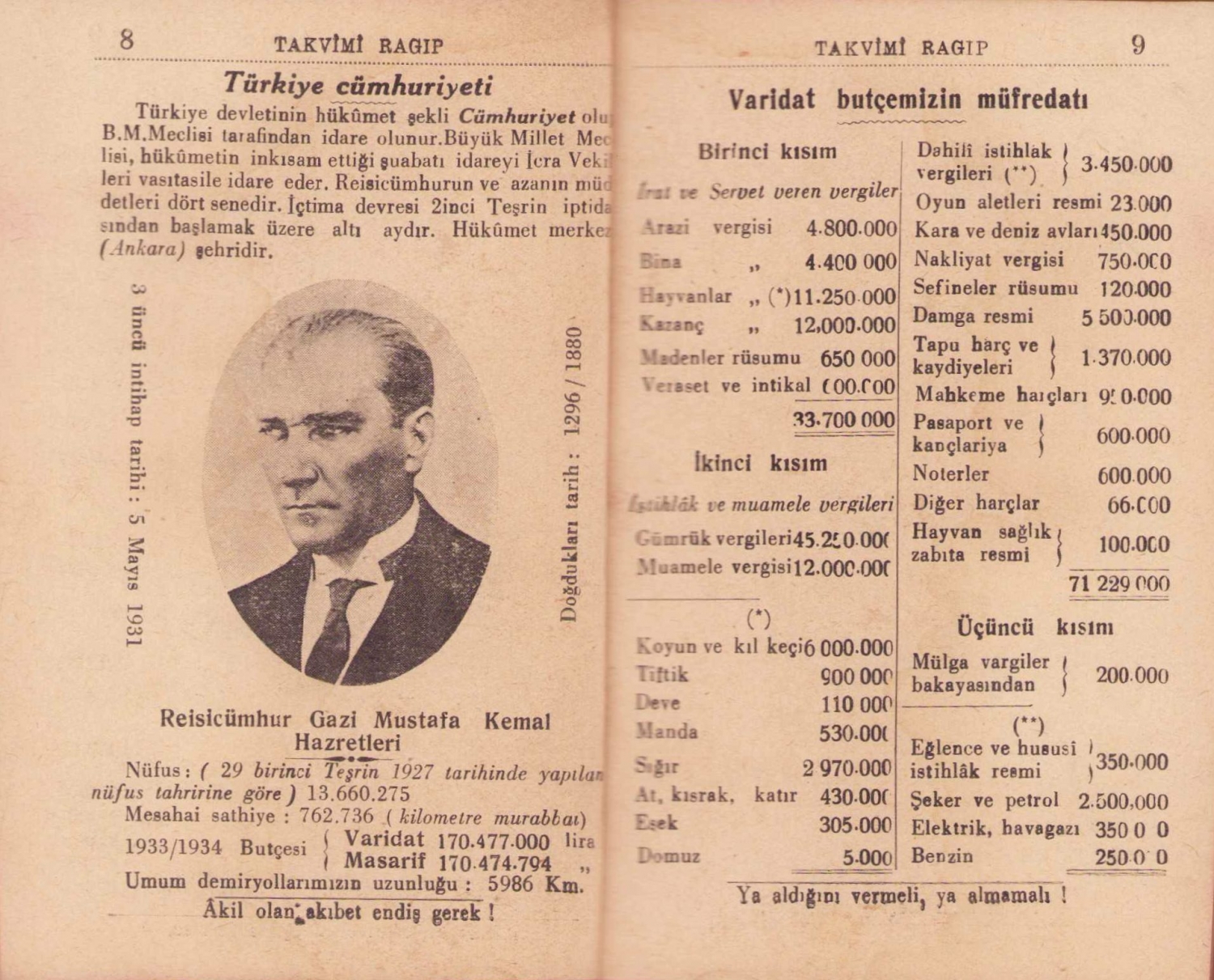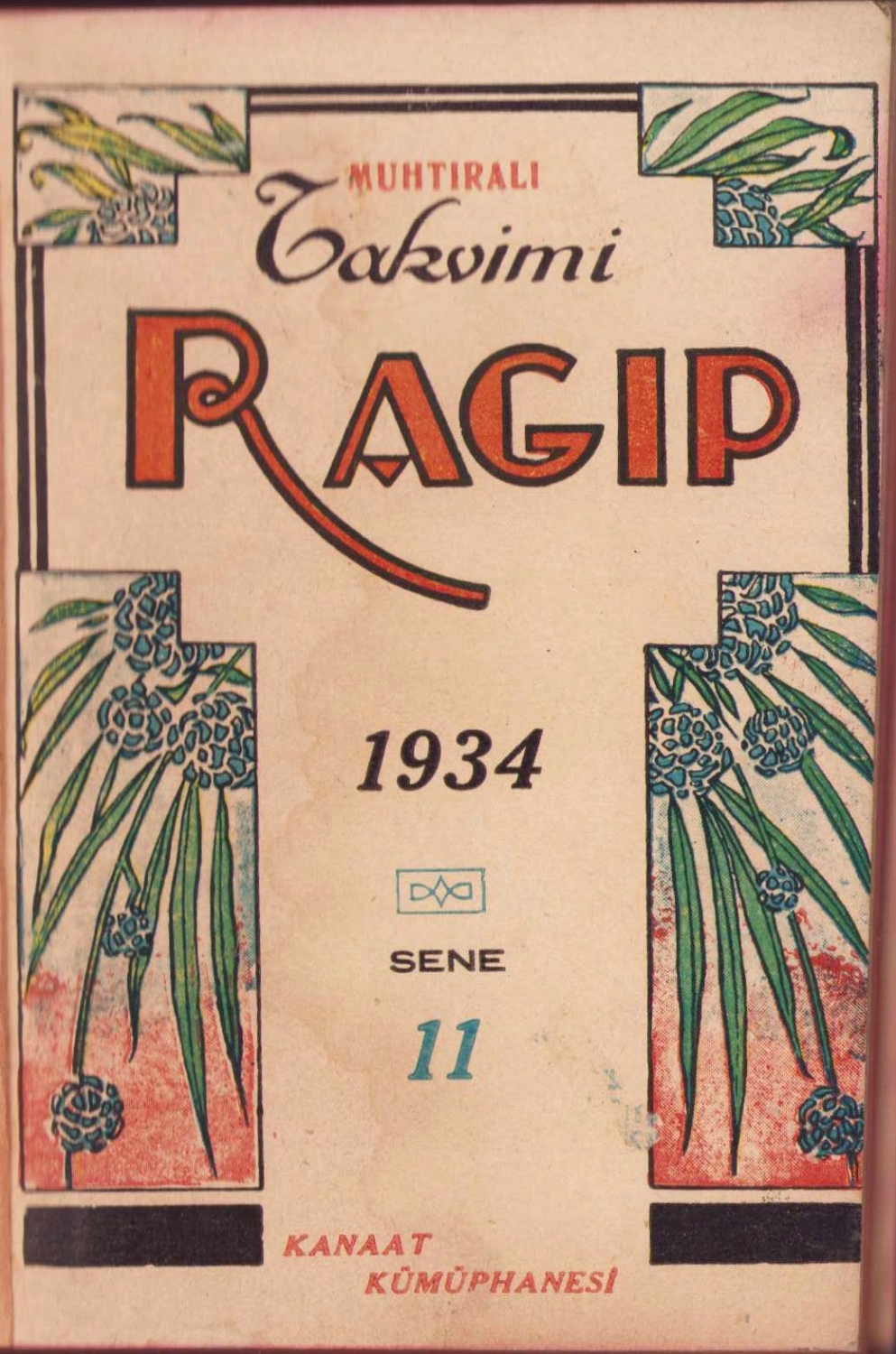 Muhtıralı Ragip Takvimi, 1934 tarihli, Kanaat Kütüphanesi baskısı, 276 sayfa, dönem reklamlı, yazılmamış, 9x13cm