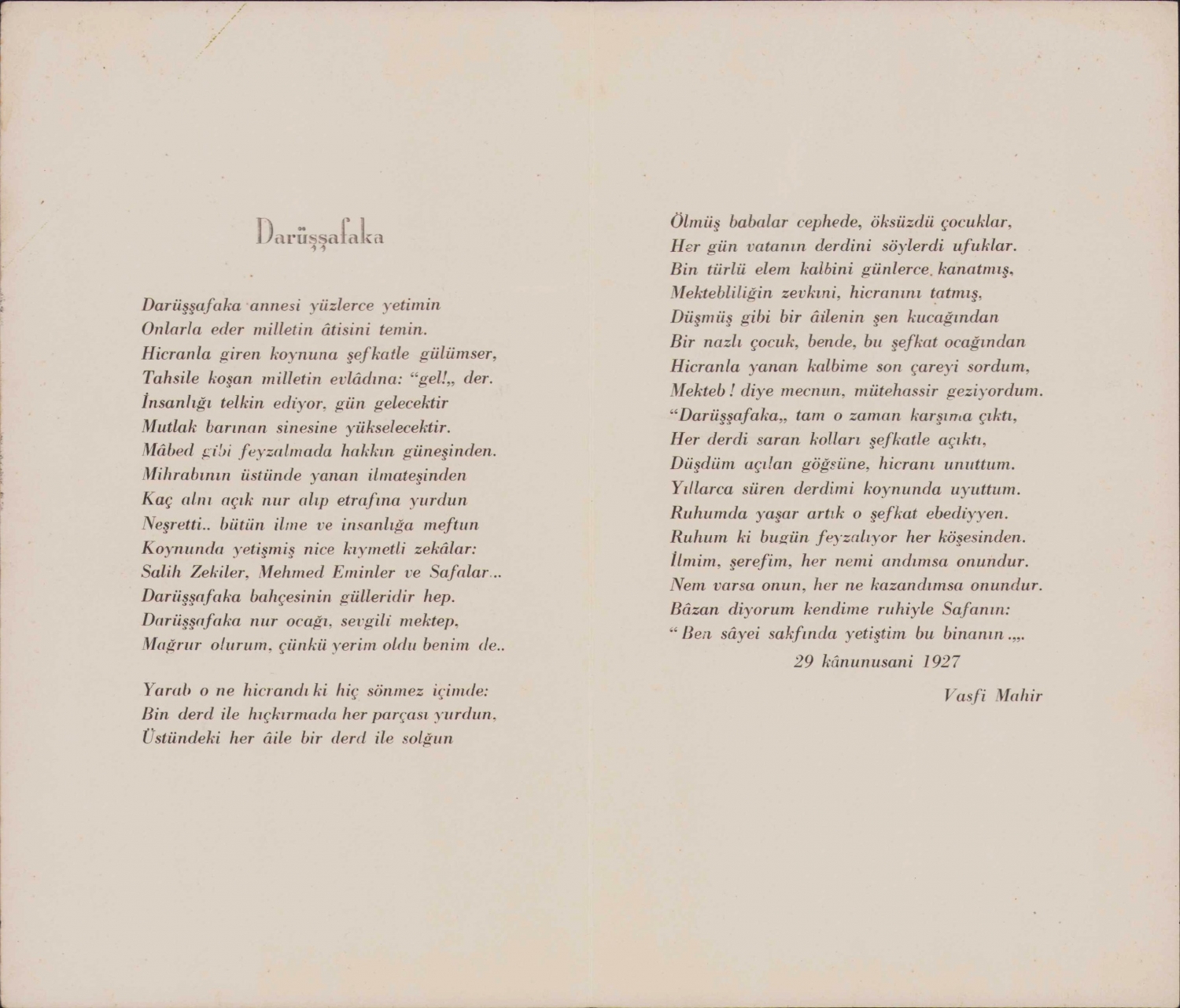 Darüşşafakalılar gecesi davetiyesi, 1936 tarihli, 2 yaprak, 4 sayfa, Başvekalet Matbaası, 13x22cm