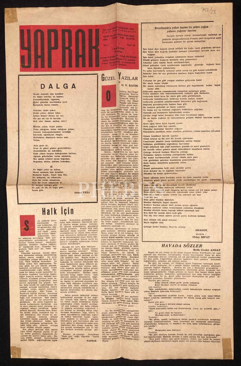 Yaprak Fikir - Sanat Gazetesi, Yıl: 1, Sayı: 15, 1 Aralık 1949, 1 sayfa, 31x49 cm, kenarları bantlı haliyle