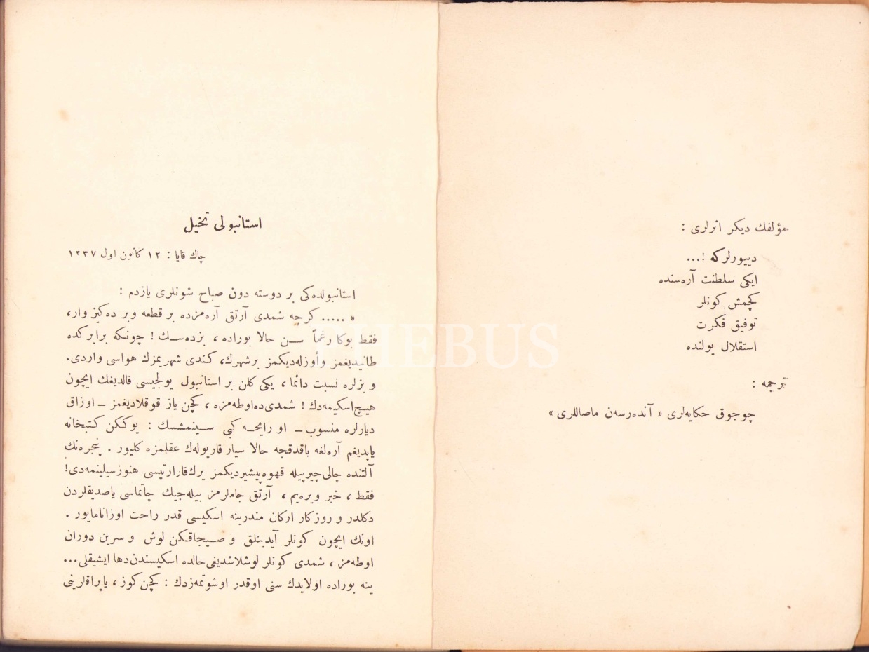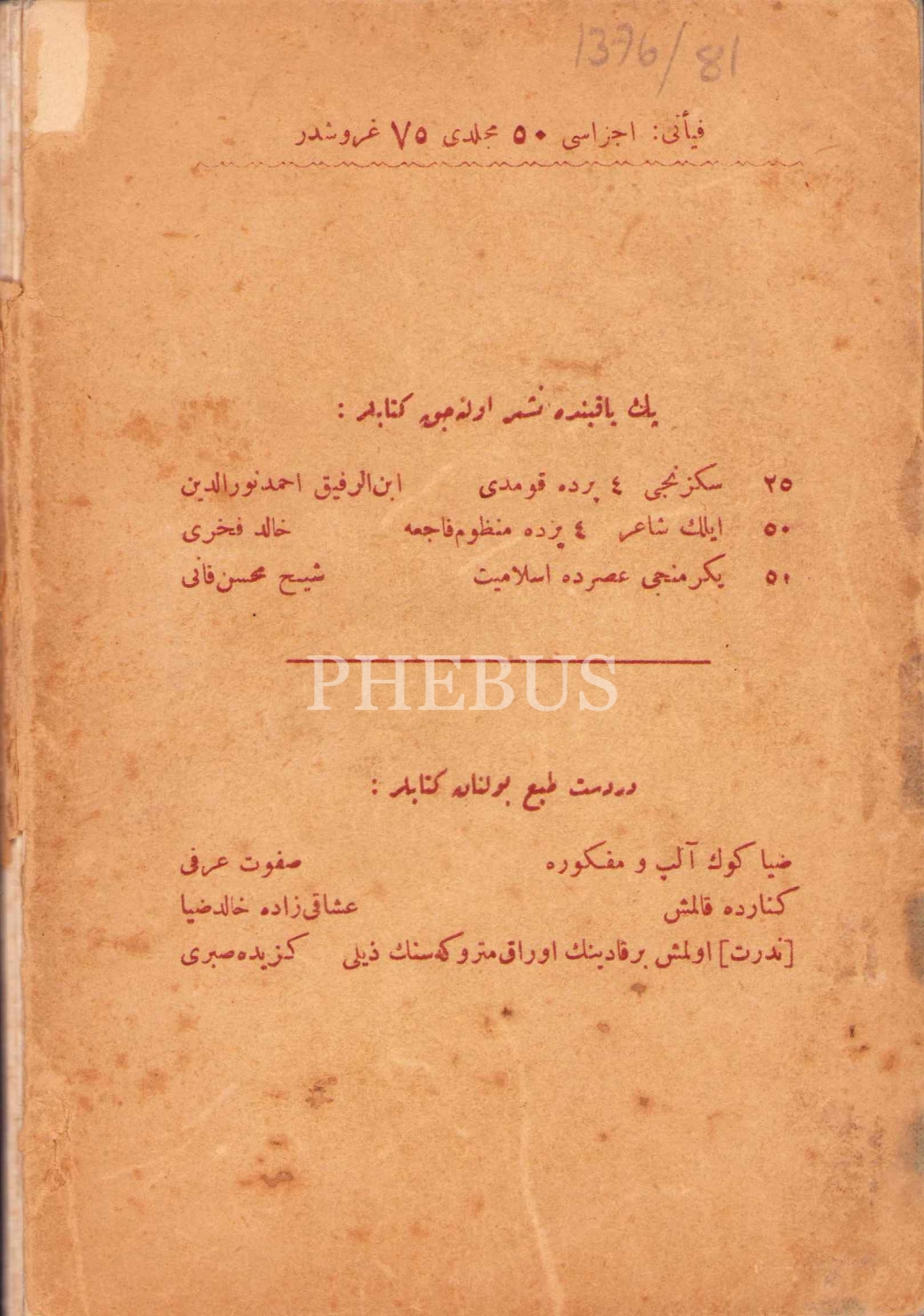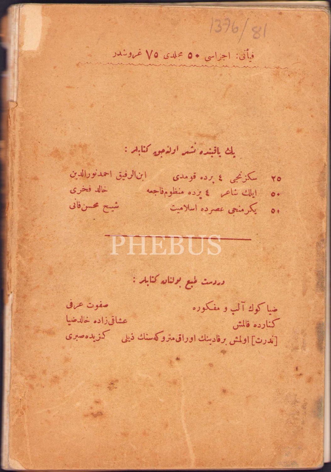İthaf, "..." muhterem Sâmiye Mahmud Nedim Hanımefendi'ye tezavu ile" Ruşen Eşref" şeklindedir.