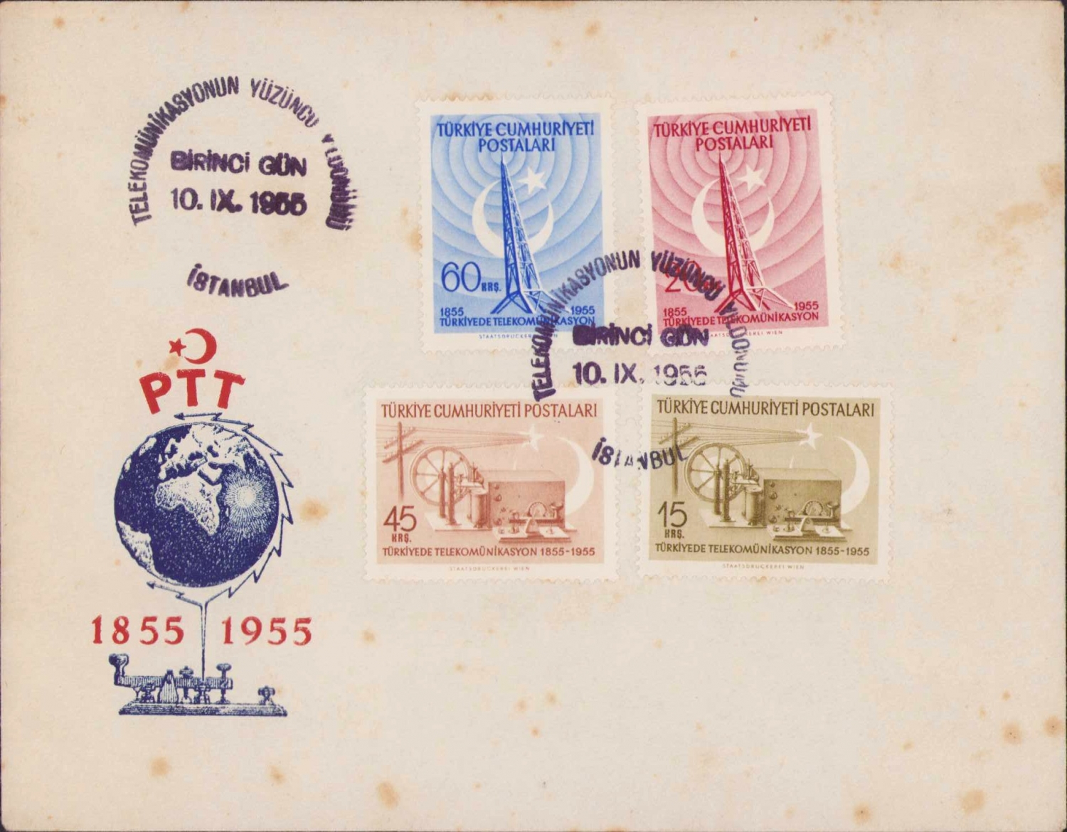 PTT'nin yüzüncü yıl dönümü temalı ilk gün zarfı, pullu, damgalı, 1955 tarihli, 16x12cm