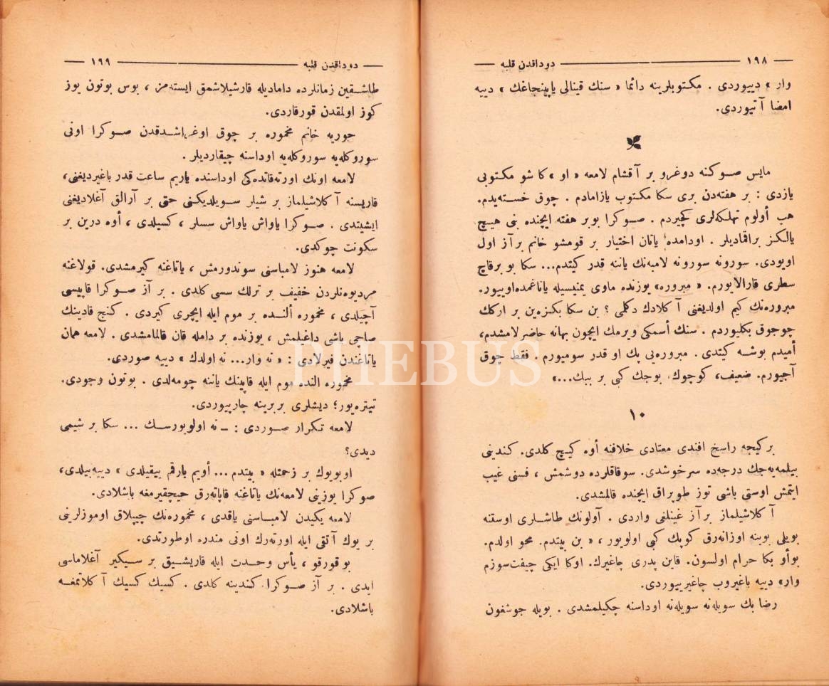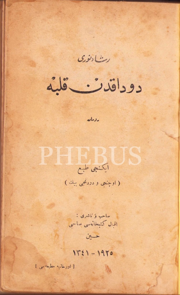 Reşat Nuri'den [Güntekin] Osmanlıca "Dudaktan Kalbe -Roman-", İkinci Tab', Orhaniye Matbaası 1925, 398 sayfa, sayfaları su almış hâliyle, 14x21 cm