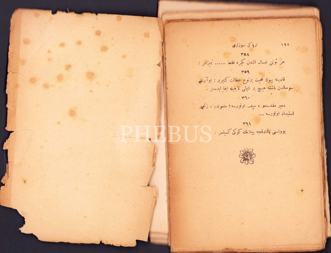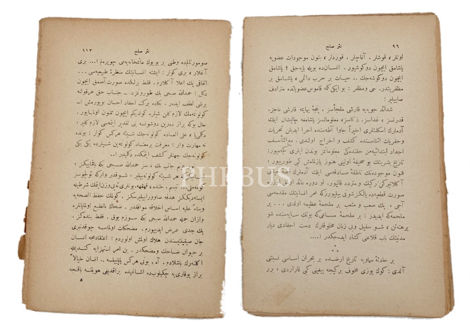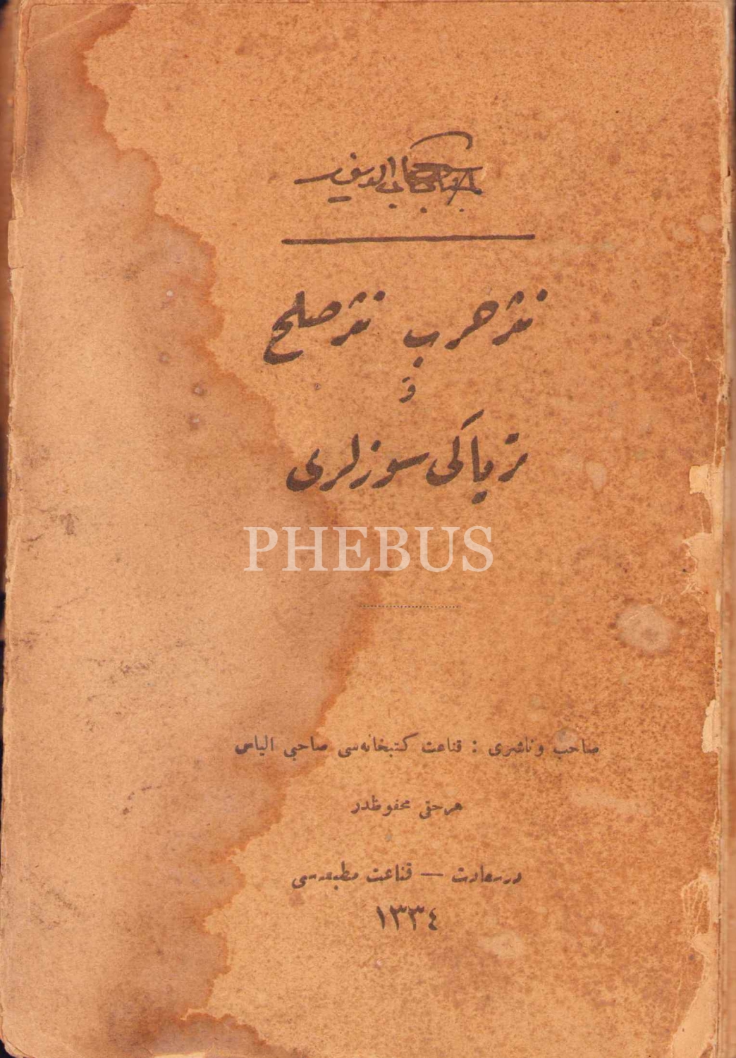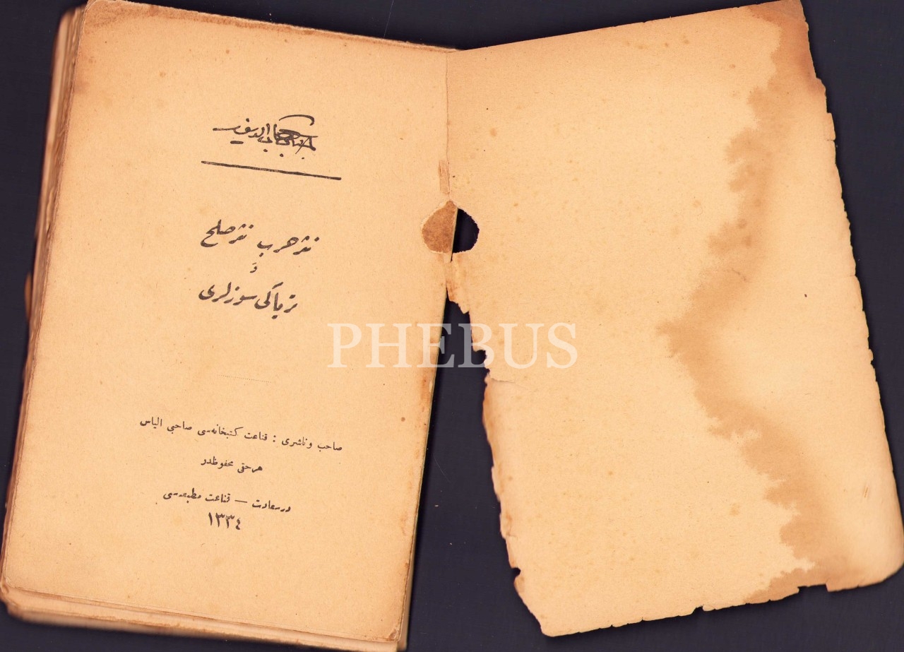 Cenap Şahabettin'den "Nesr-i Harb Nesr-i Sulh ve Tiryaki Sözleri" Kitabı, Dersaadet Kanaat Matbaası 1334, 192 sayfa, sayfaları oldukça yıpranmış ve su almış hâliyle, 12x19 cm