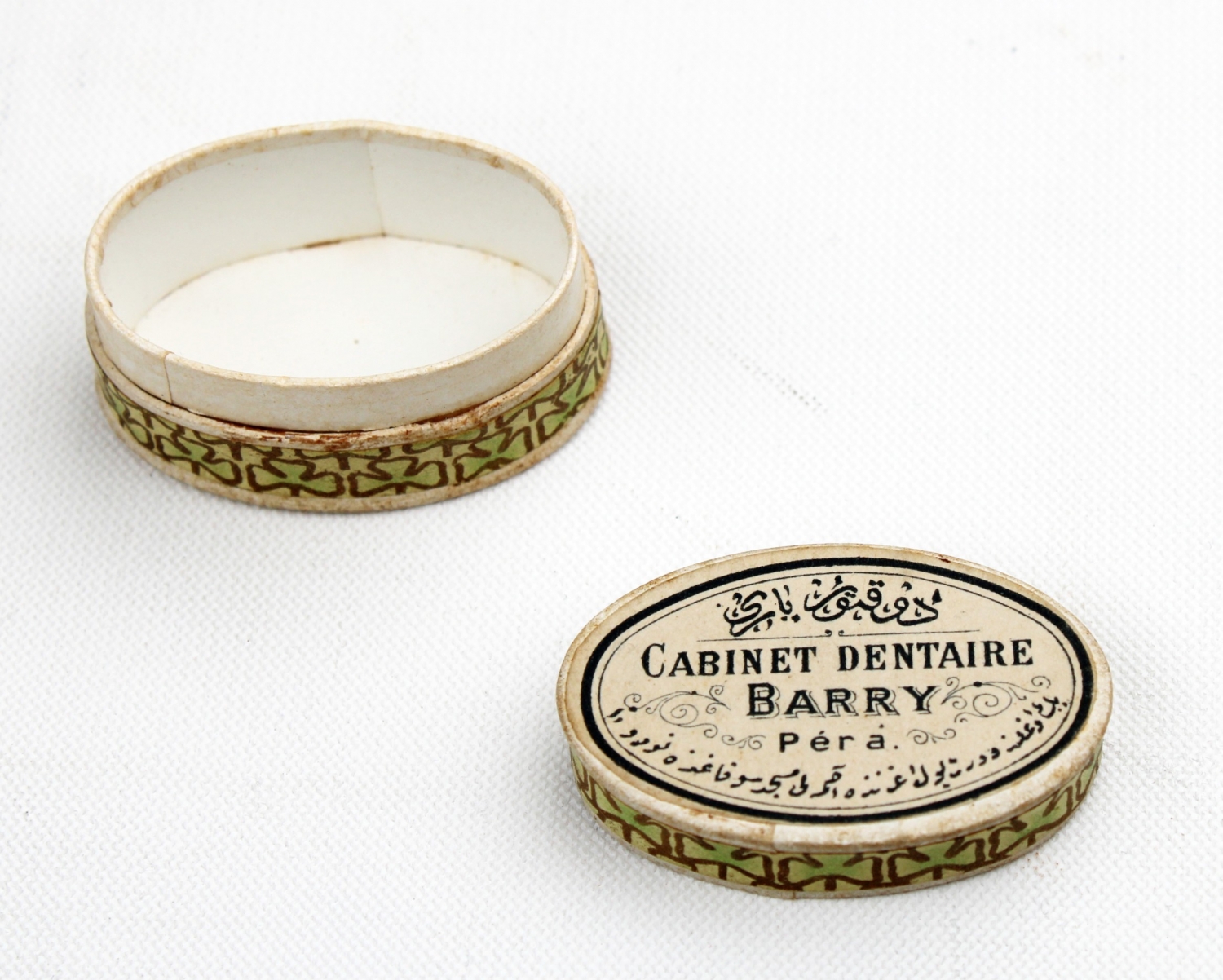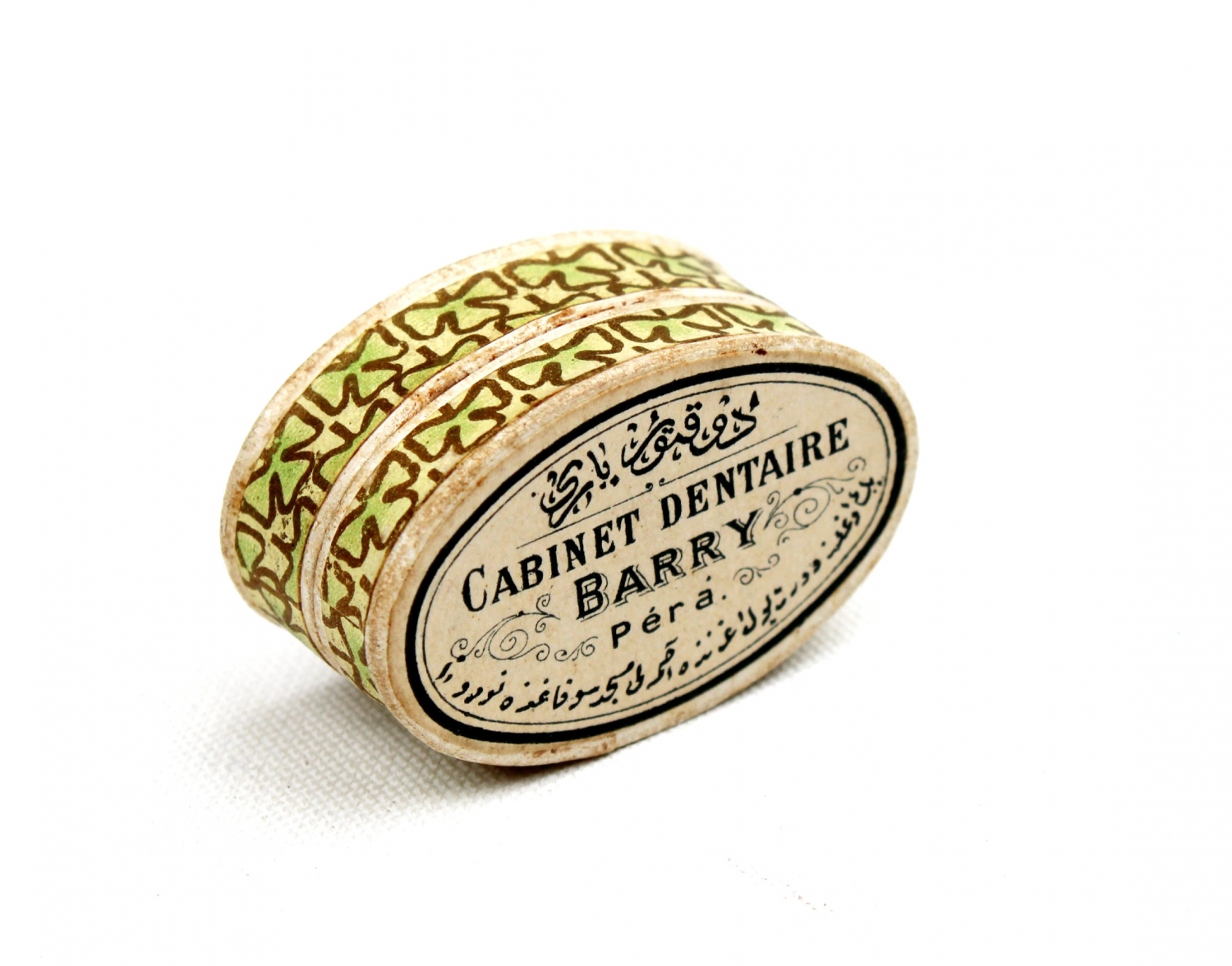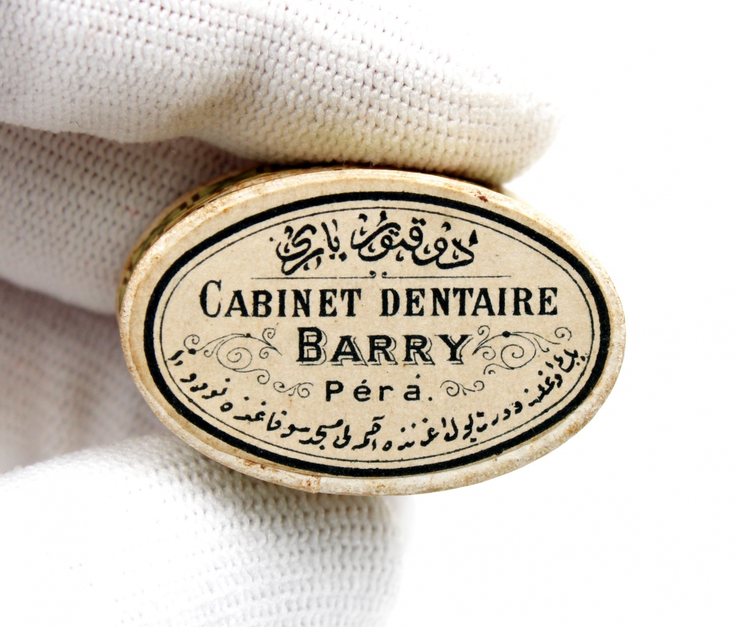 Osmanlıca Diş Doktoru Barry Beyoğlu Pera yazılı, Fransızca-Osmanlıca, mukavva kutu, 3,5x1,5cm