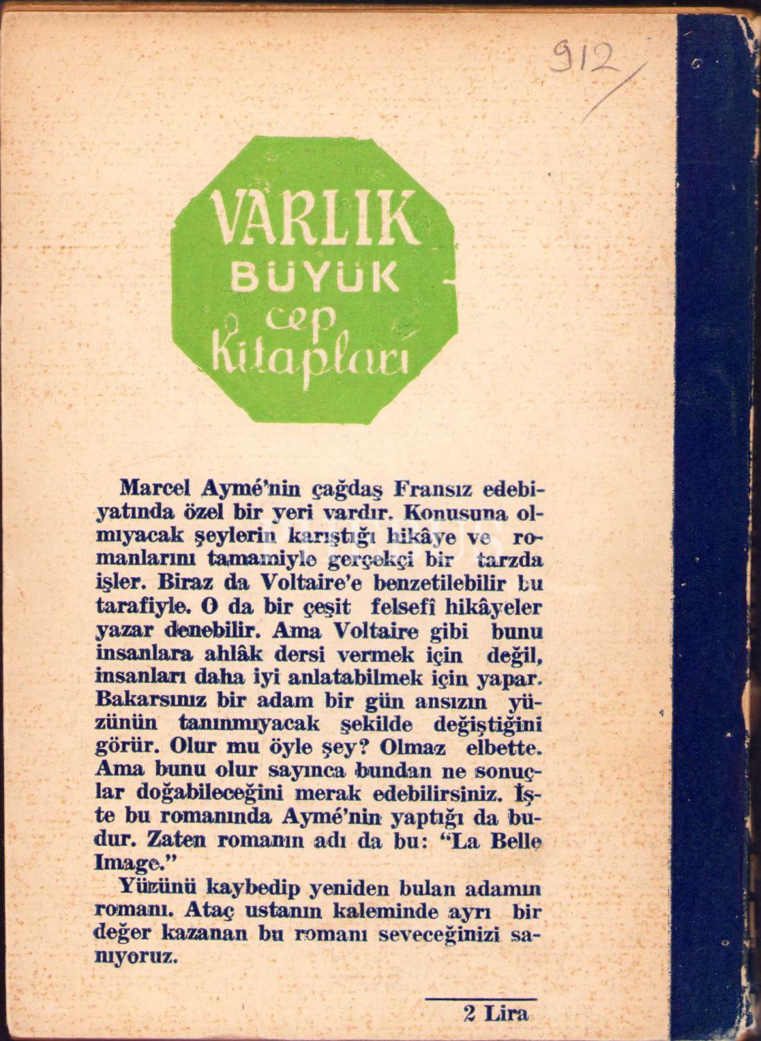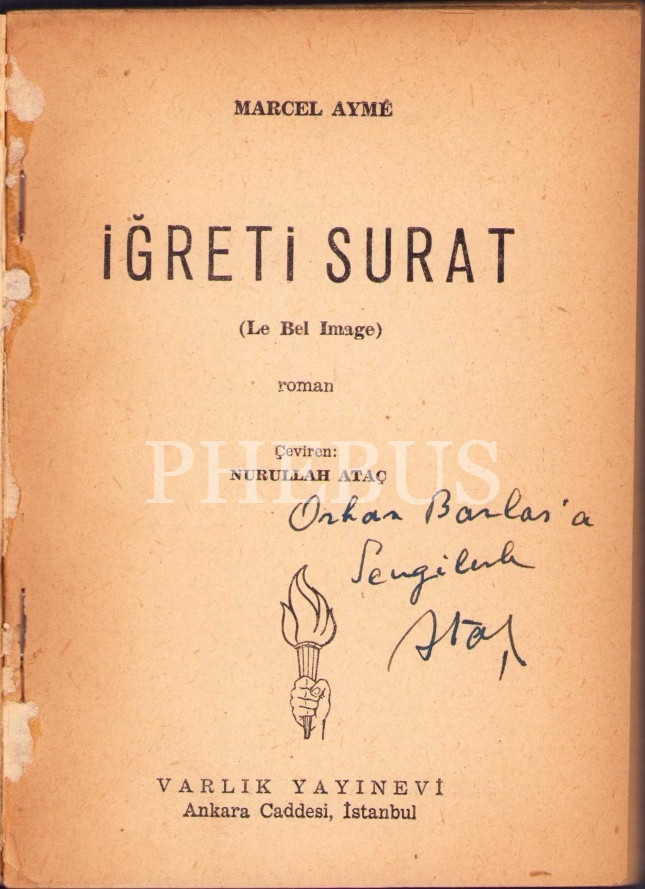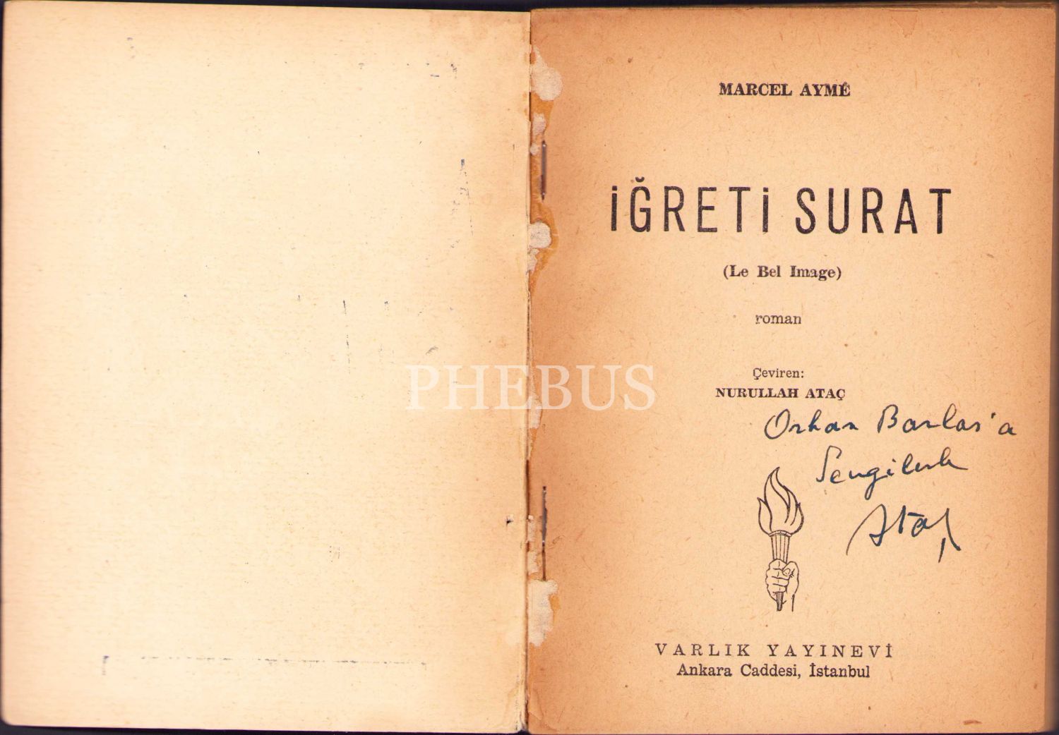 Nurullah Ataç'ın Tercüme Ettiği "Marcel Aymé, İğreti Surat" Nurullah Ataç'tan İthaflı ve İmzalı, Varlık Yayınları, Aralık 1955, 182 sayfa, sayfaları açılmamış hâliyle, 12x16 cm