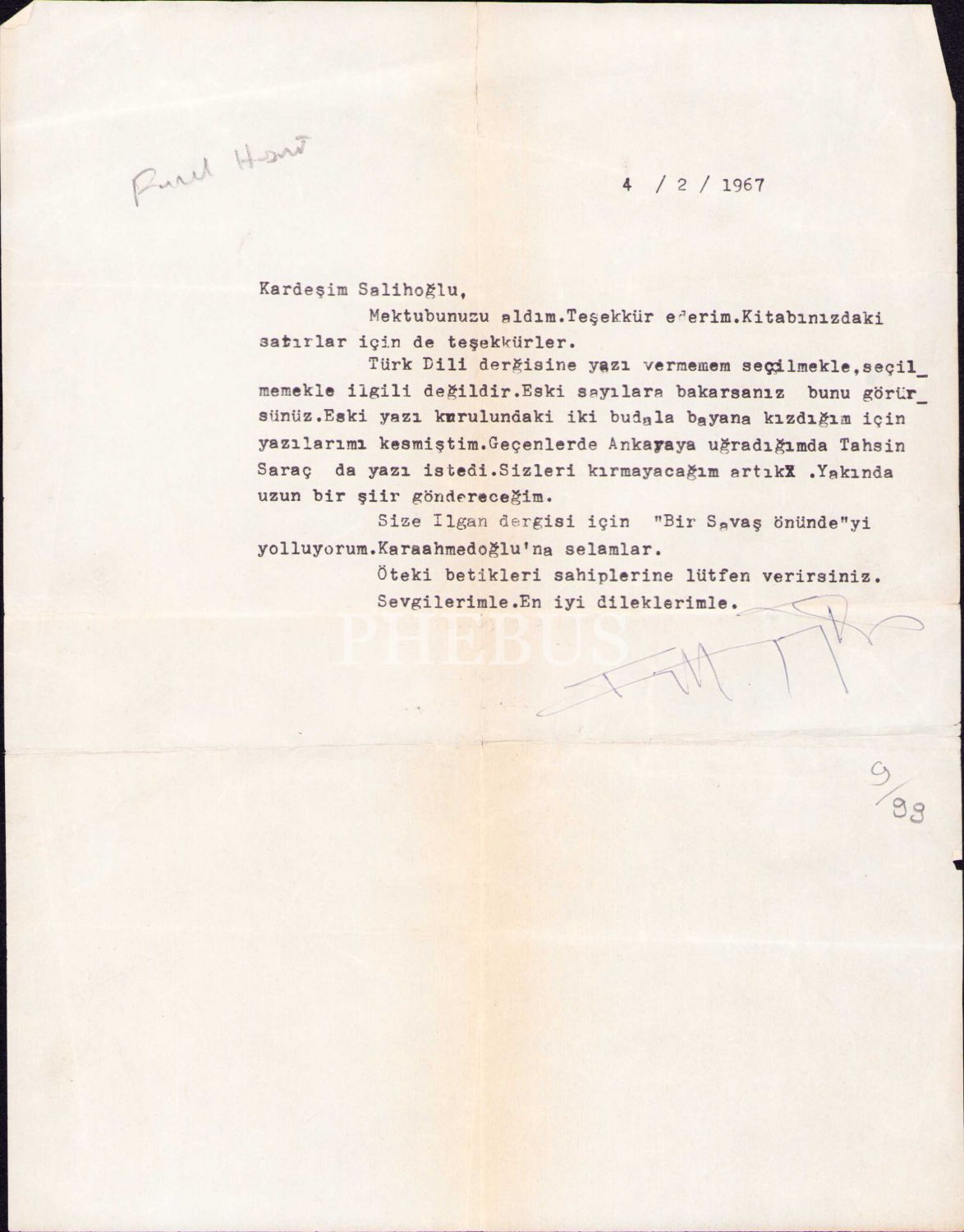 Fazıl Hüsnü Dağlarca'dan İmzalı Mehmet Salihoğlu'ya Yazılmış 1967 Tarihli Mektup