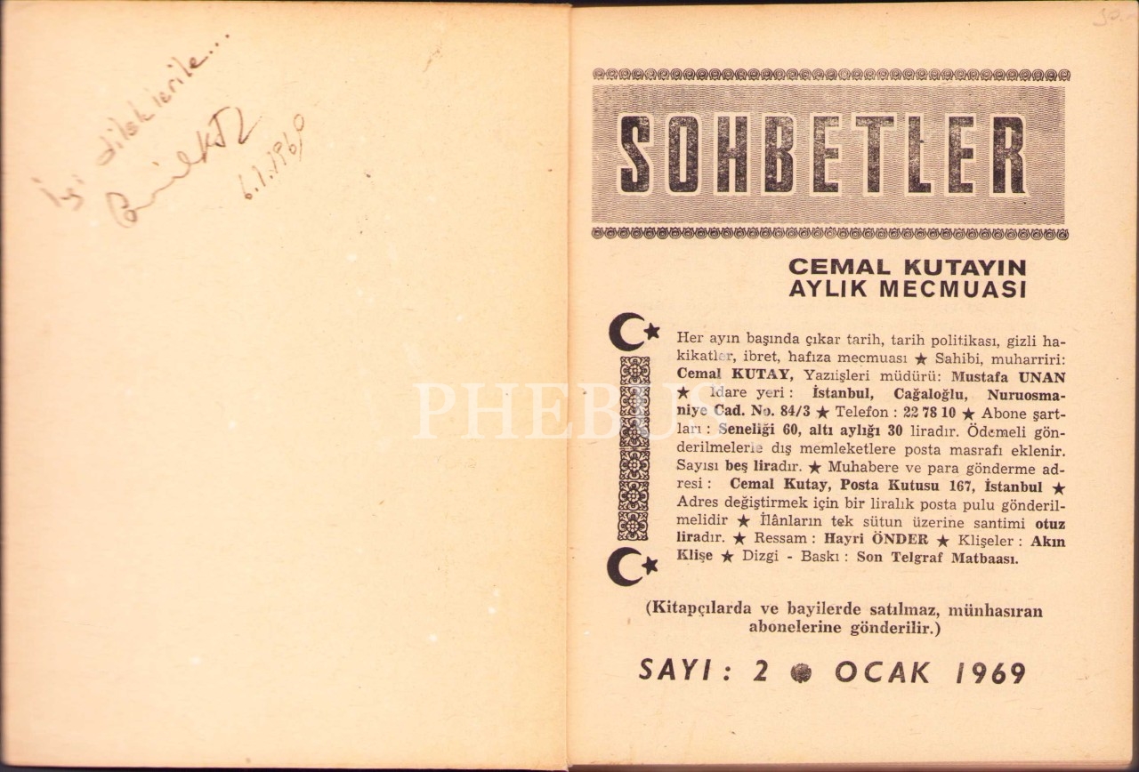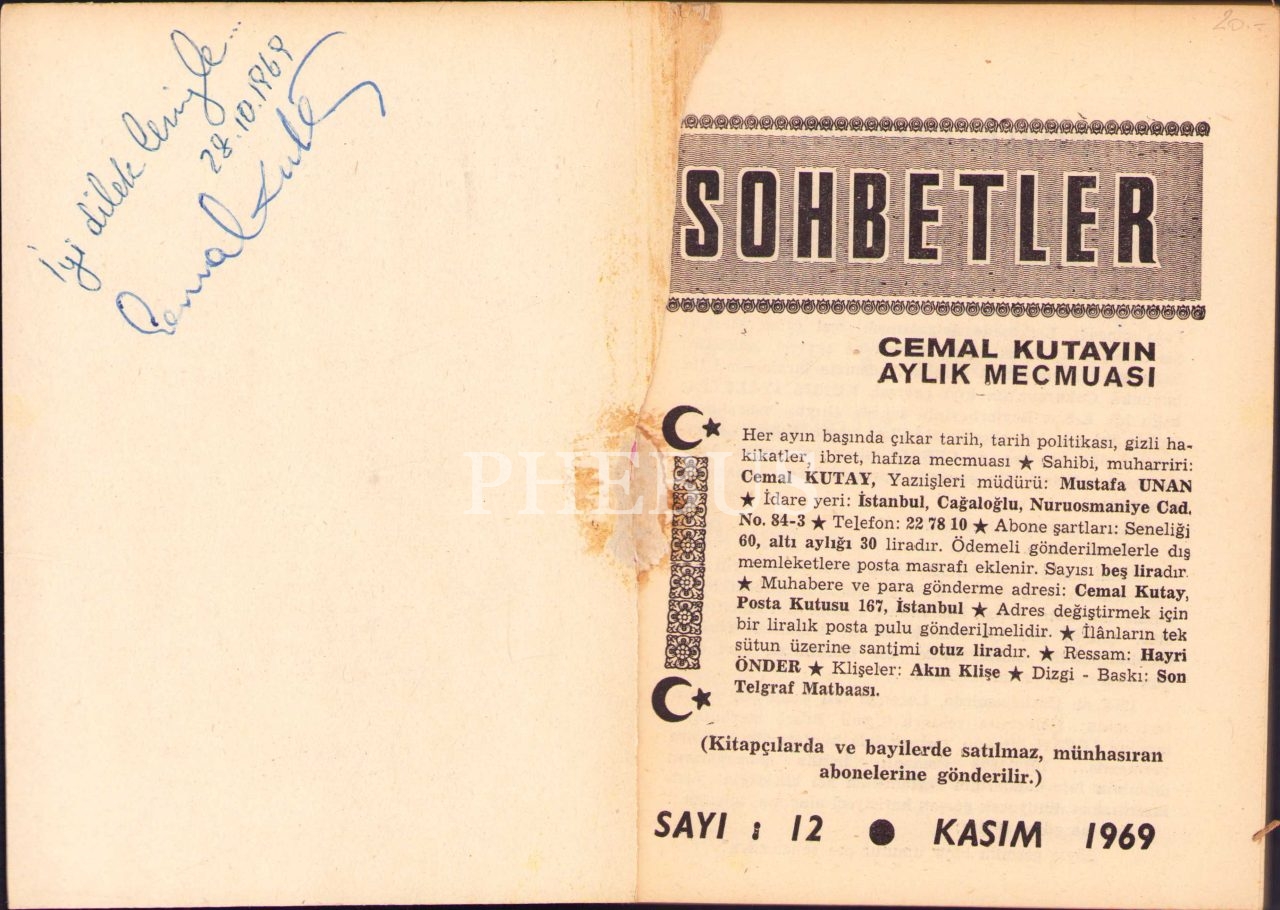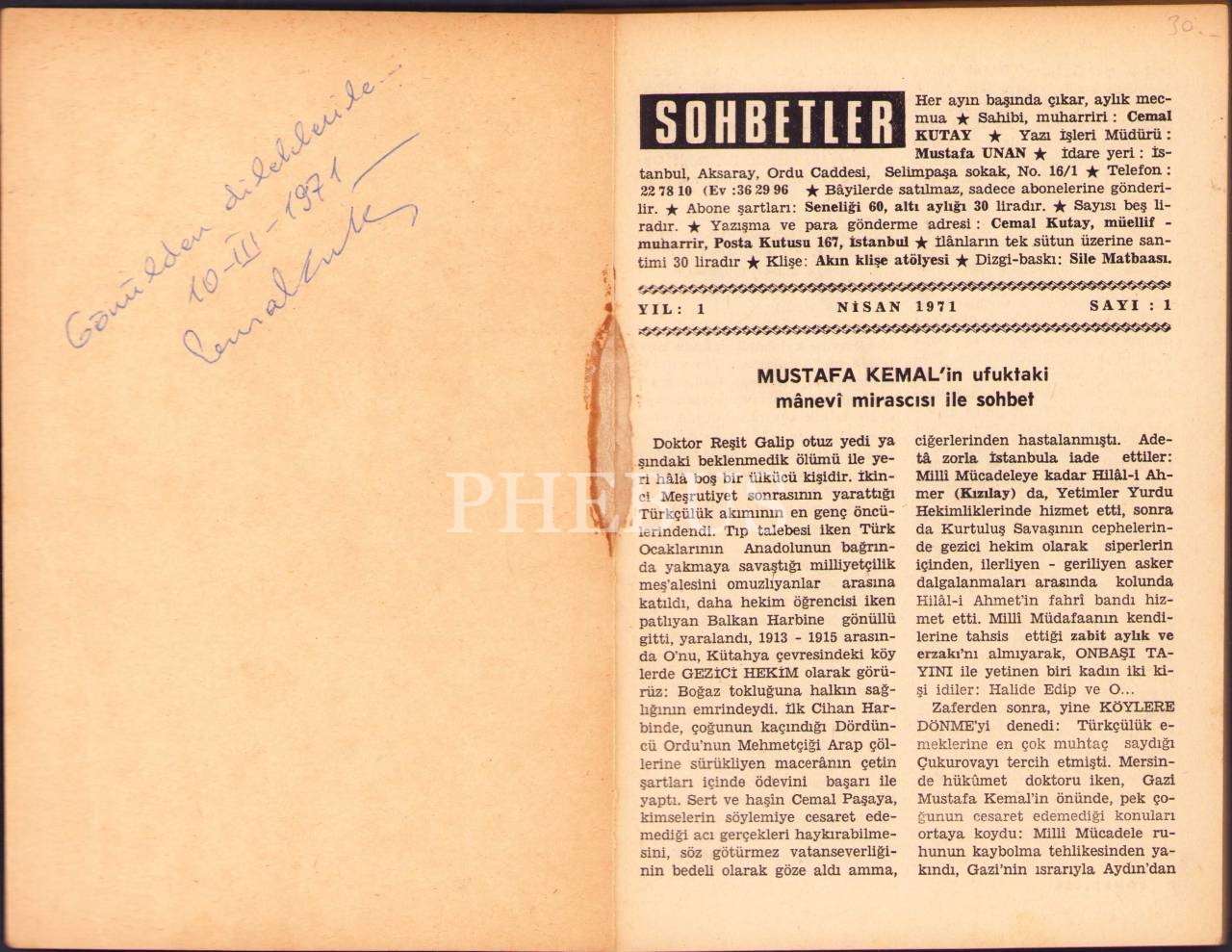 İthaflar genellikle "İyi dileklerile... [Tarih] Cemal Kutay" şeklinde olup, birinde ithaf, "Sohbetlerim vede saygılarımla. Sağlık, saadet, huzur dileklerimle. 11.2.1970 Cemal Kutay" şeklindedir. Sayılar: 1 (Aralık 68), 2 (Ocak 69), 12 ( Kasım 69), 16 (Mart 70) -- 1 (Nisan 71), 2 (Mayıs 71), 3 (Haziran 71)