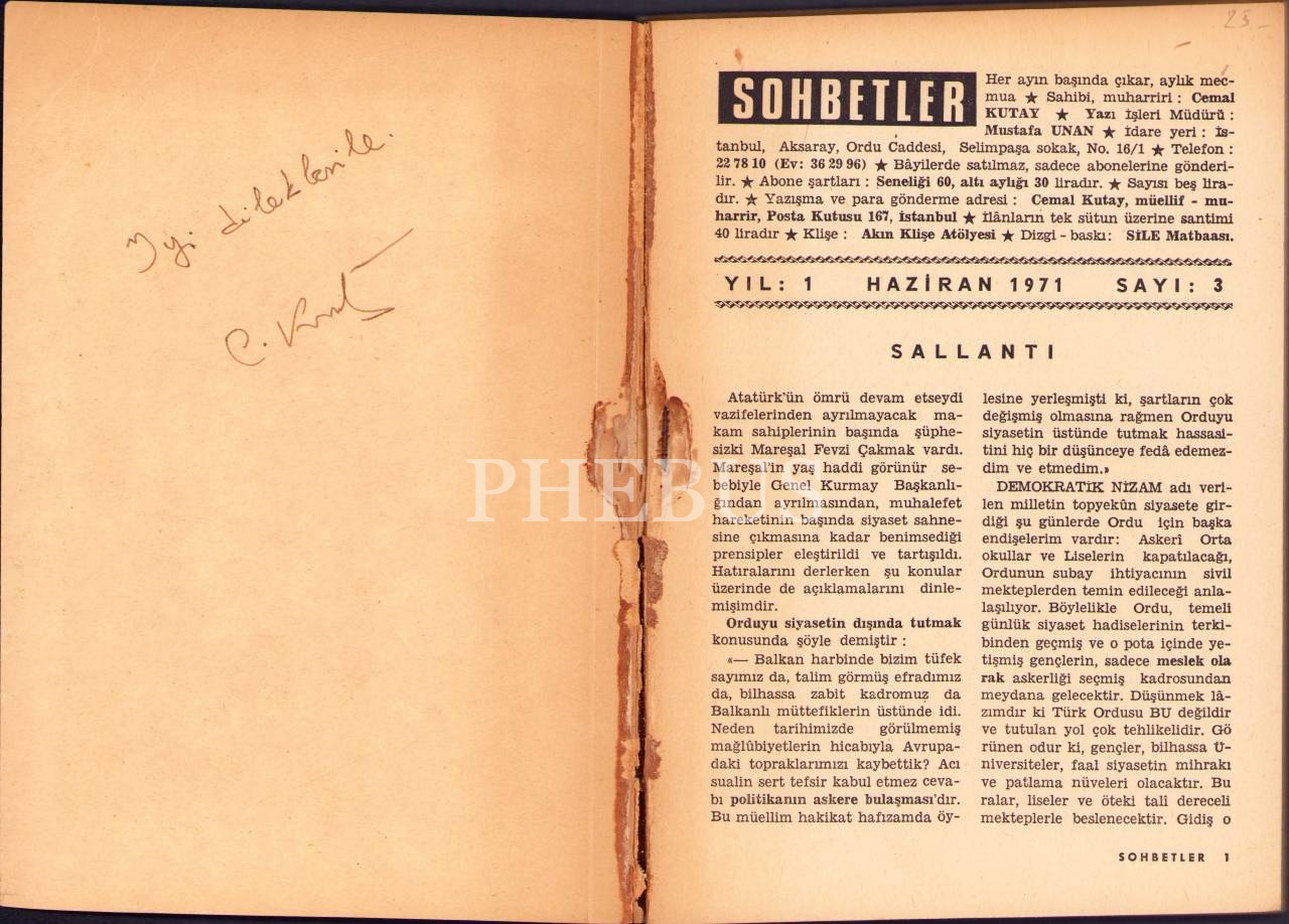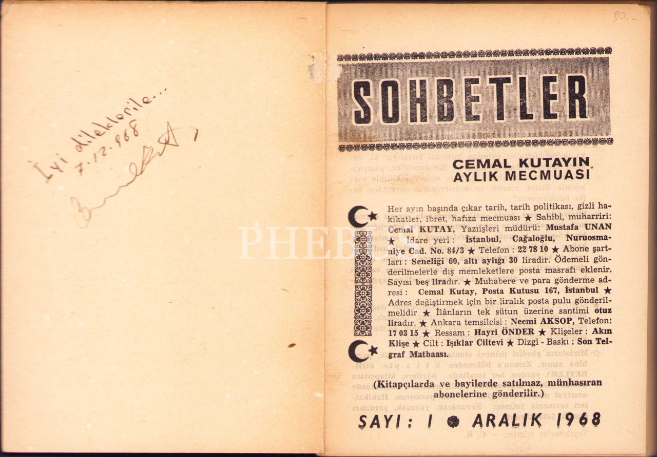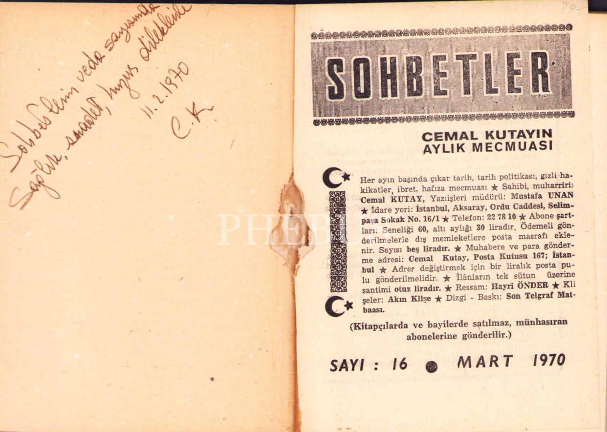 İthaflar genellikle "İyi dileklerile... [Tarih] Cemal Kutay" şeklinde olup, birinde ithaf, "Sohbetlerim vede saygılarımla. Sağlık, saadet, huzur dileklerimle. 11.2.1970 Cemal Kutay" şeklindedir. Sayılar: 1 (Aralık 68), 2 (Ocak 69), 12 ( Kasım 69), 16 (Mart 70) -- 1 (Nisan 71), 2 (Mayıs 71), 3 (Haziran 71)