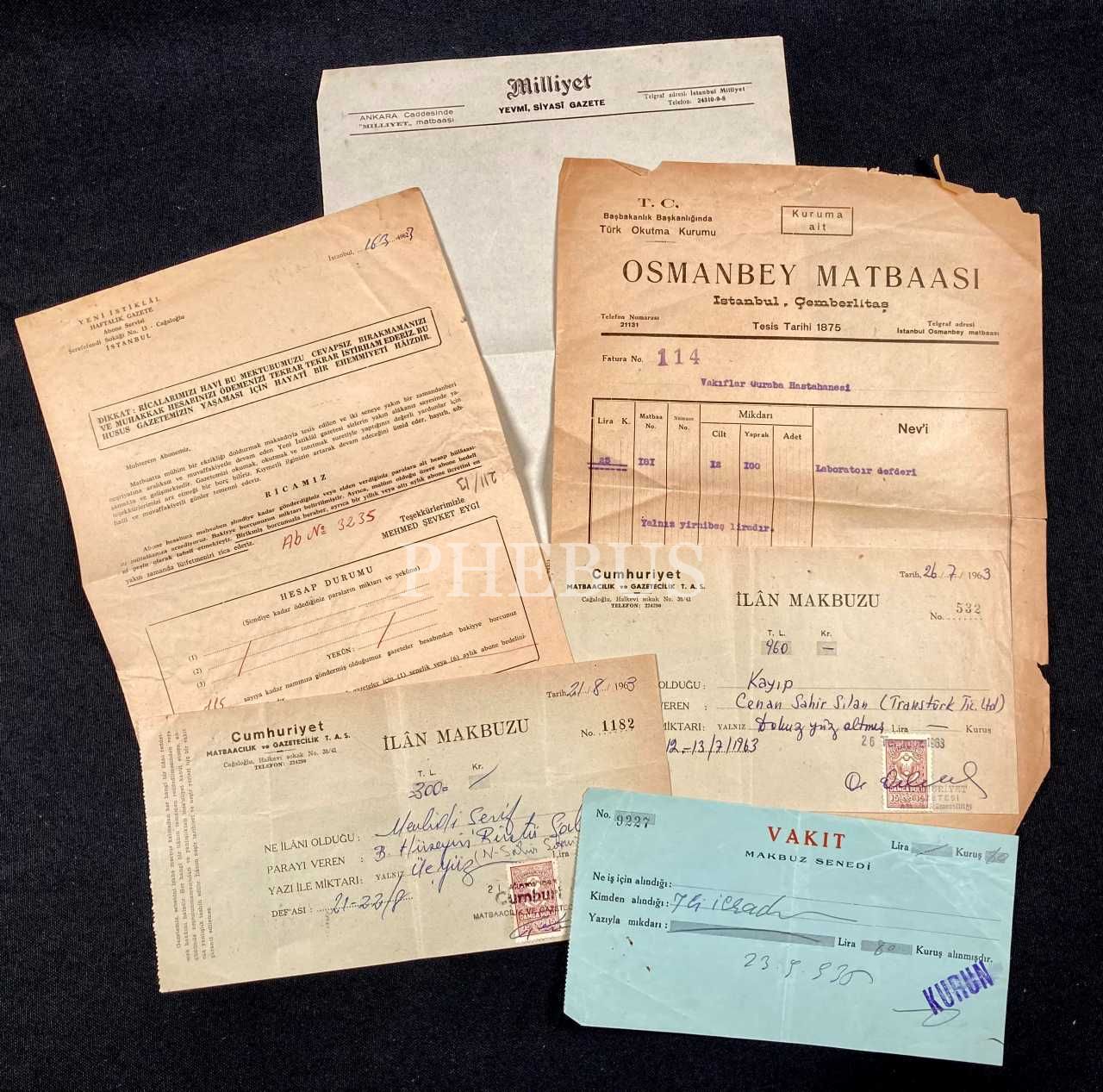 Cumhuriyet gazetesine ait makbuz, Mehmed Şevket Eygi'den Yeni İstiklâl gazetesi adına abone ücreti için rica mektubu, Milliyet gazetesi antetli boş kâğıt, T.C. Başbakanlık Başkanlığından Türk Okutma Kurumu-Osmanbey Matbaası faturası ve Vakıt antetli makbuz senedi.