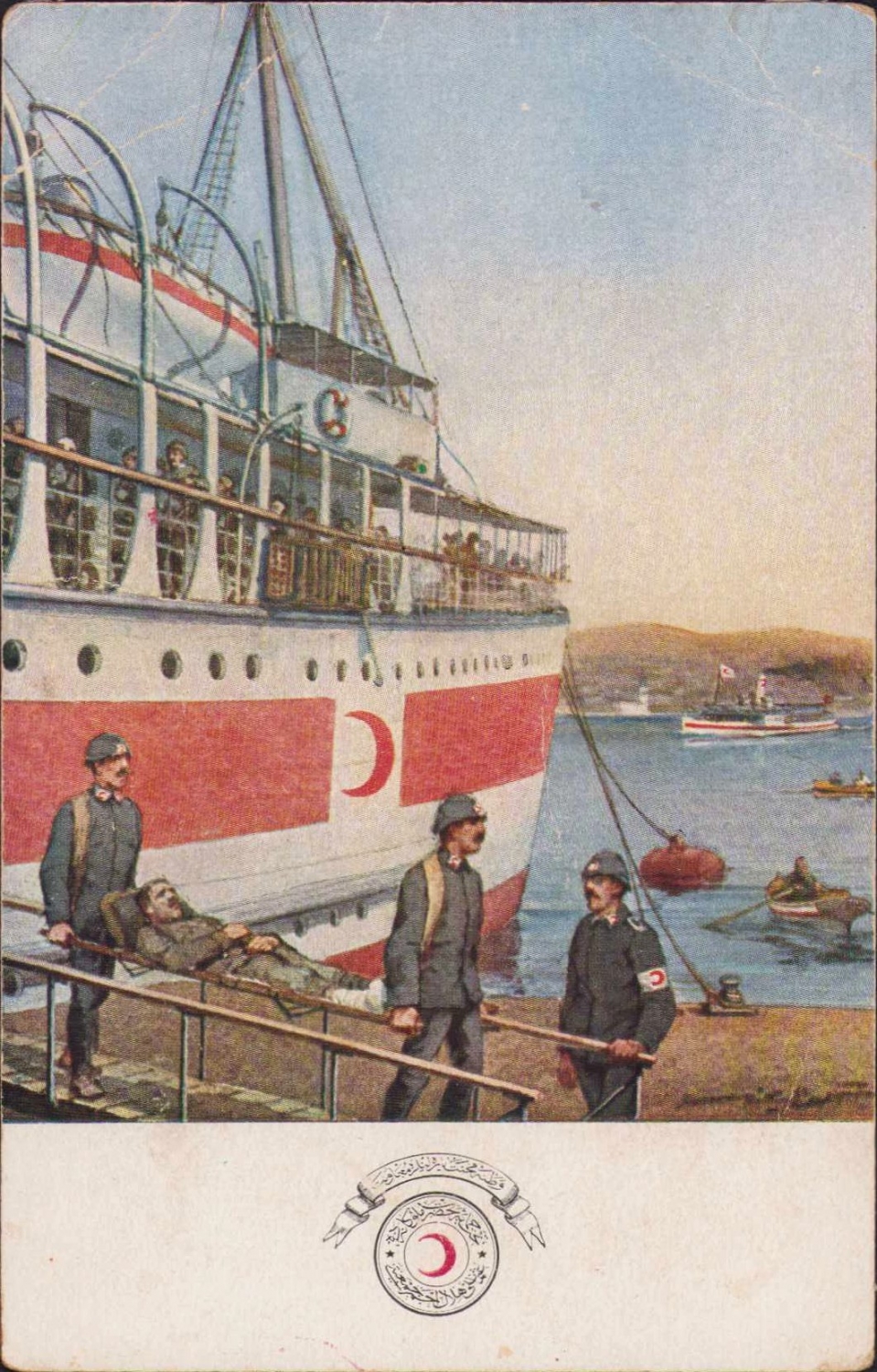 Osmanlı“Taht-ı himâye-i hazret-i mulûkânede Osmânlı Hilâl-i Ahmer Cemiyeti” yazılı, damganın üzerindeki kurdele de ise Hilâl-i Ahmer Cemiyeti’nin savaş zamanı sloganı var: