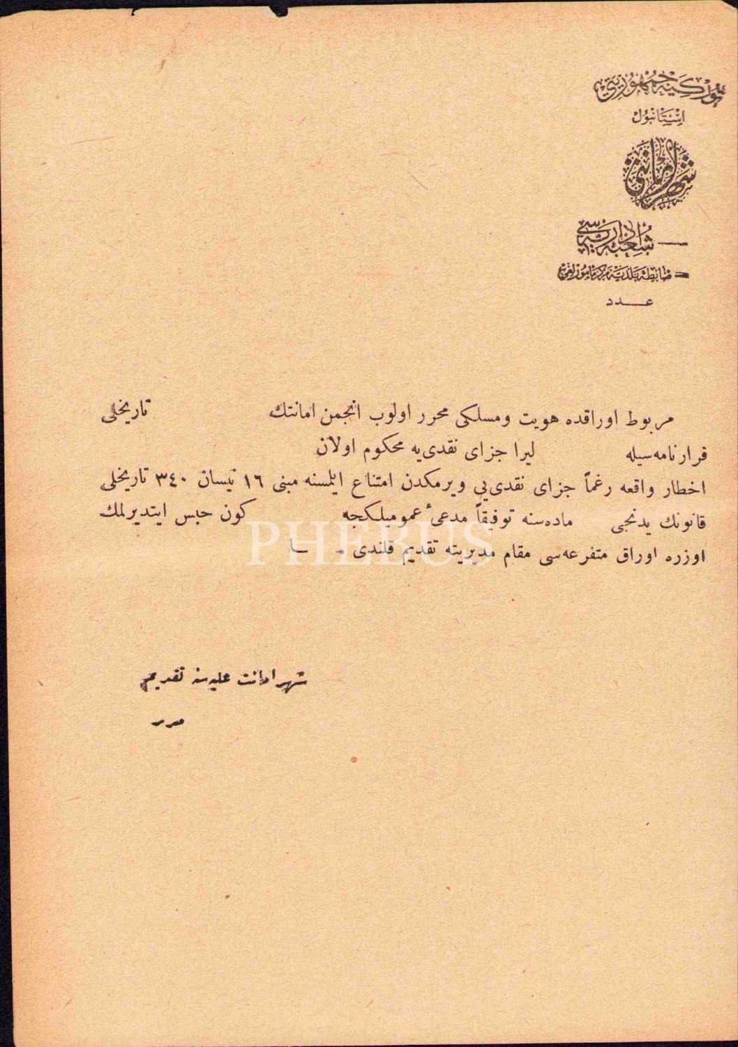 Osmanlıca Türkiye Cumhuriyeti İstanbul Şehremâneti antetli boş hapis cezası karar kâğıdı, 14x20 cm
