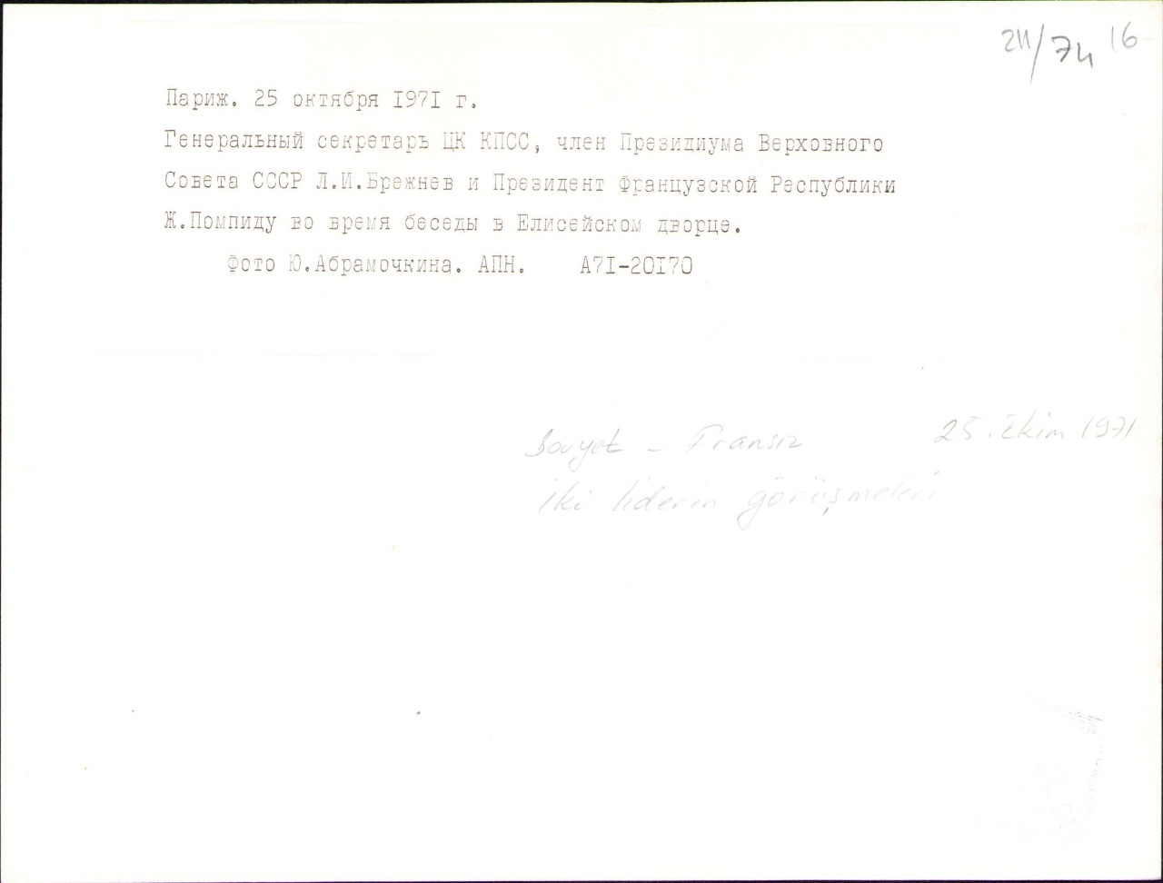 Sovyetler Birliği ile Fransa liderlerinin 1971 tarihli görüşmesinden, arka yüzünde Rusça bilgi mevcut, 18x24 cm