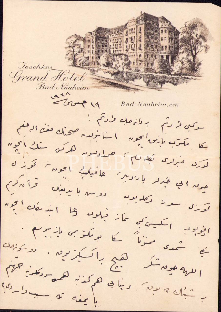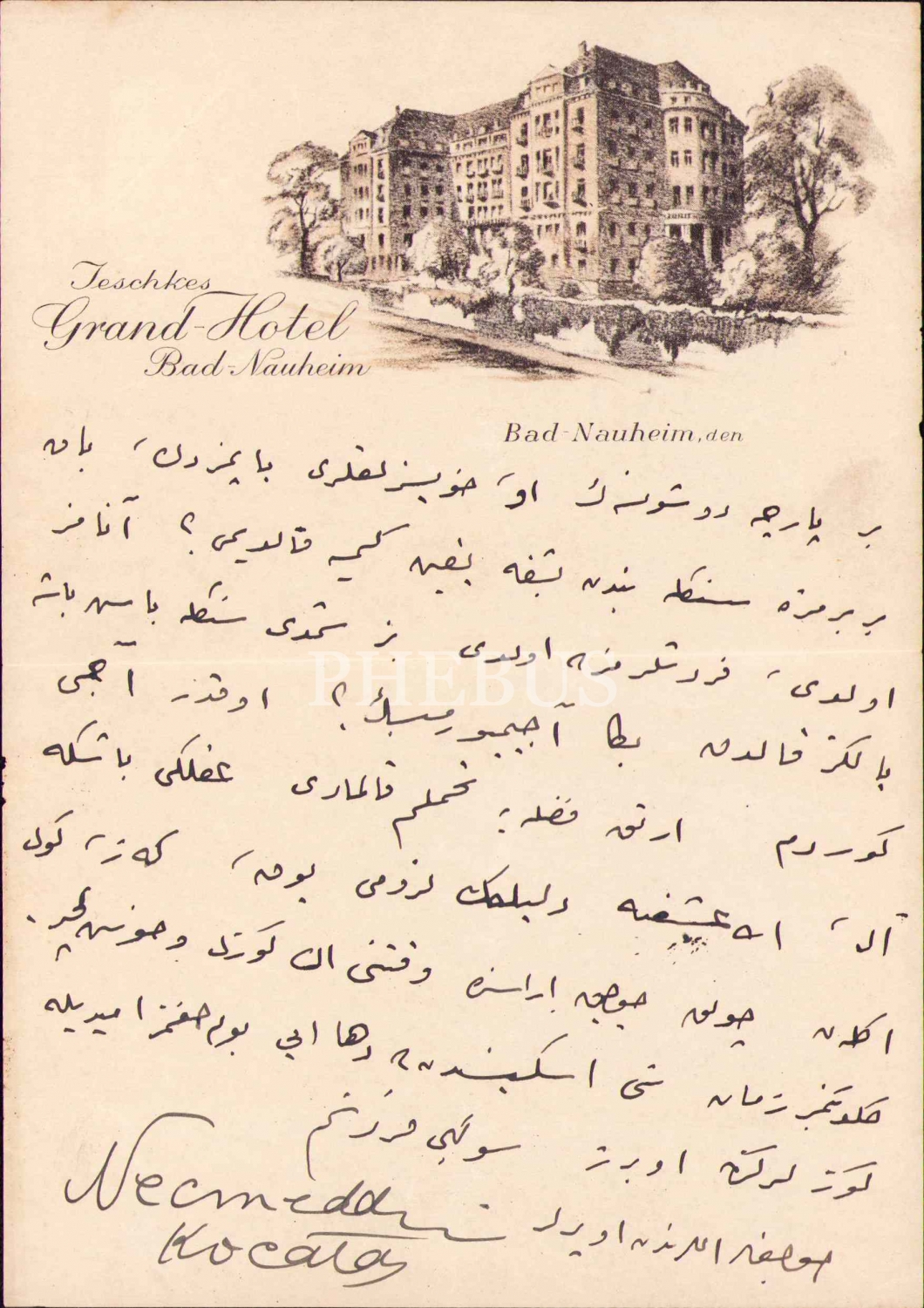 Teschkes Grand-Hotel Bad-Nauheim antetli kâğıtta Necmettin Kocataş(?) imzalı Osmanlıca şahsi mektup, 1928 tarihli, 2 sayfa, 15x21 cm