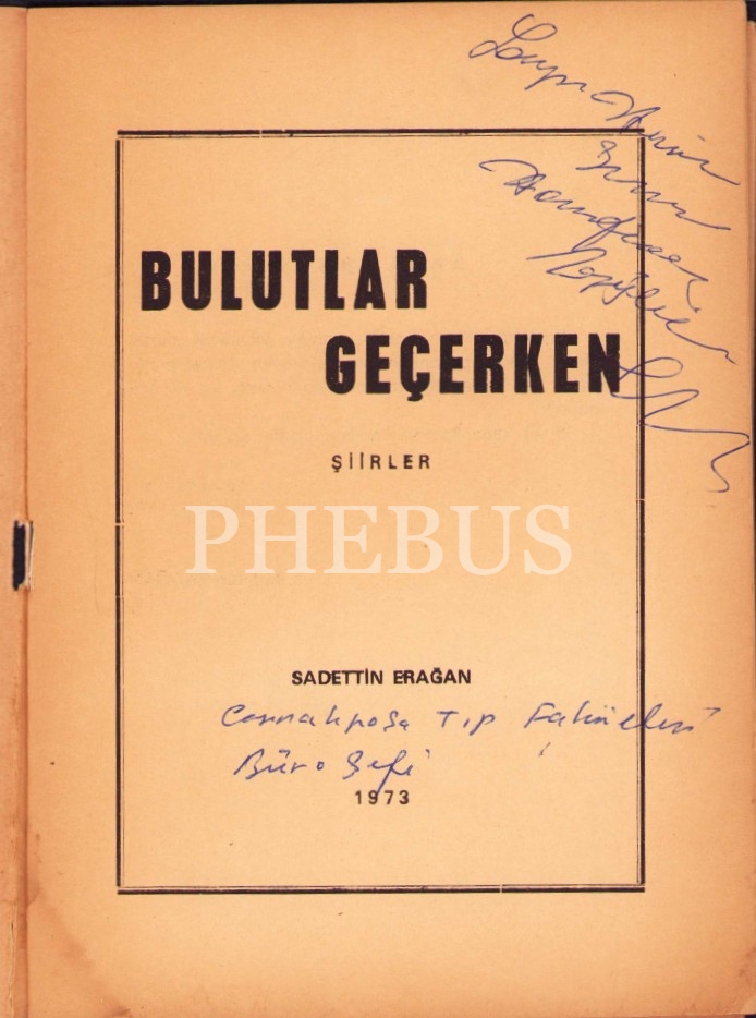 Bulutlar Geçerken -Şiirler-, Sadettin Erağan, 1973, ithaflı, 40 s., 14x19 cm, su görmüş haliyle