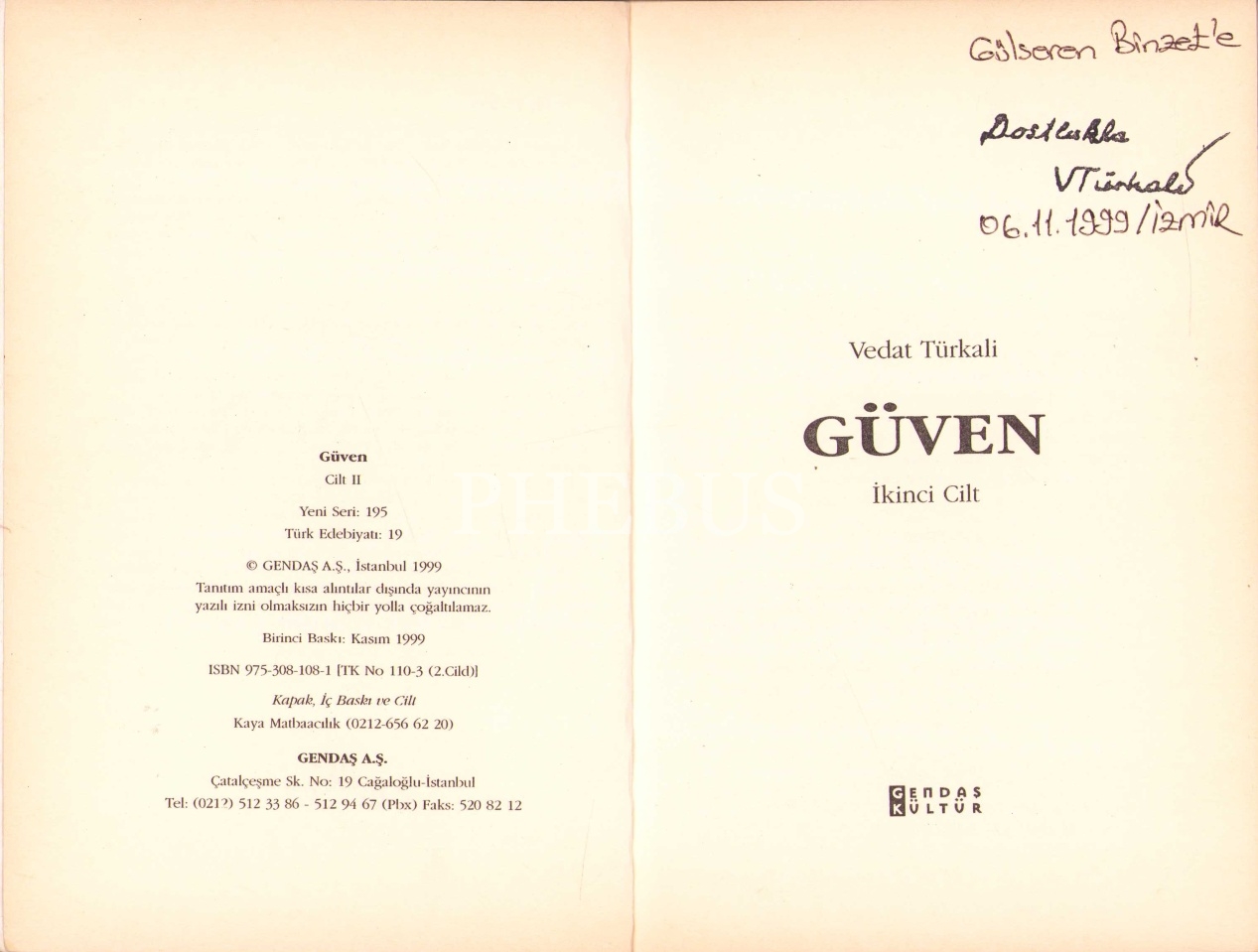 Güven - 2. Cilt, Vedat Türkali, yazarından ithaflı ve imzalı, Gendaş Kültür Yay., İstanbul 1999, 520 s., 14x19 cm