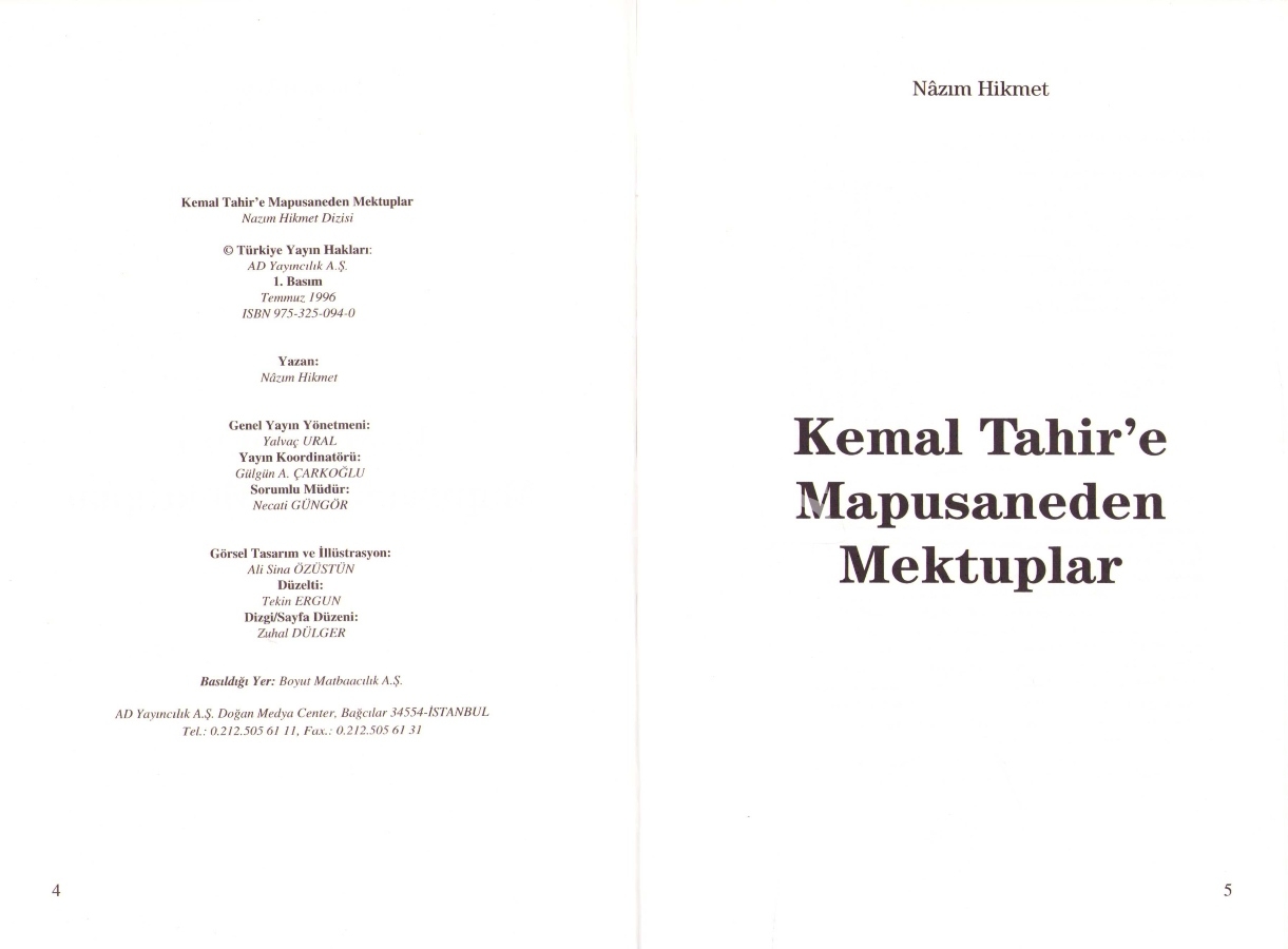 Kemal Tahir'e Mapusane'den Mektuplar, Nâzım Hikmet, Milliyet Yayınları, İstanbul 1996, 355 s., 16x24 cm
