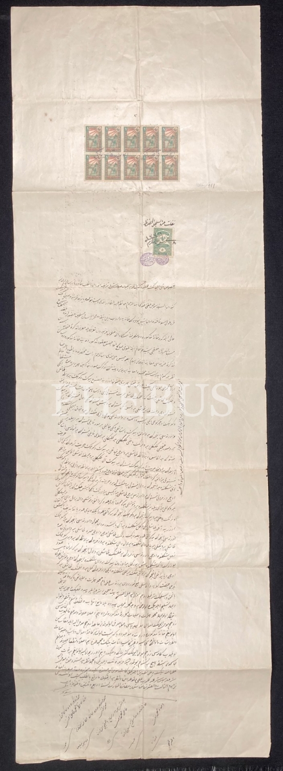 Bir kadının, mücevherlerini ve diğer mal varlığını, vefatına değin kendisine bakıp beslemesi şartıyla kocasına teslim ettiğine dair 1334 tarihli Osmanlıca hüccet, 31x94 cm