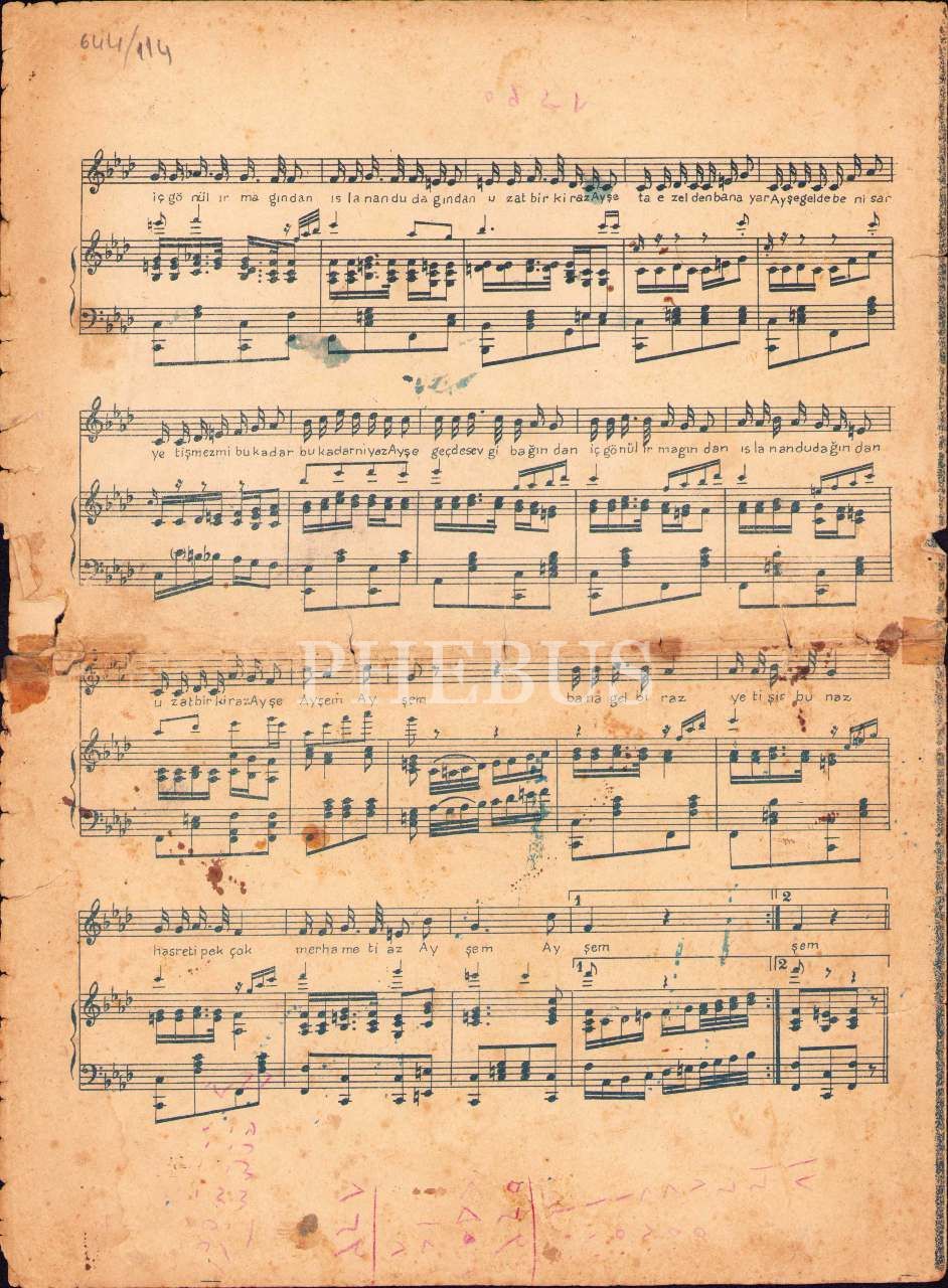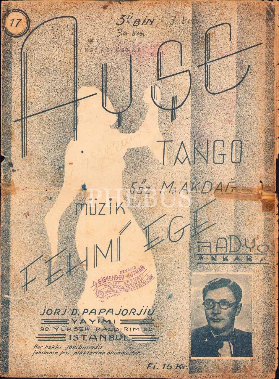 Fehmi Ege'ye ait "Ayşe" tango notası, Jorj D. Papajorjiu Yayımı, İstanbul, 25x34 cm, yıpranmış haliyle