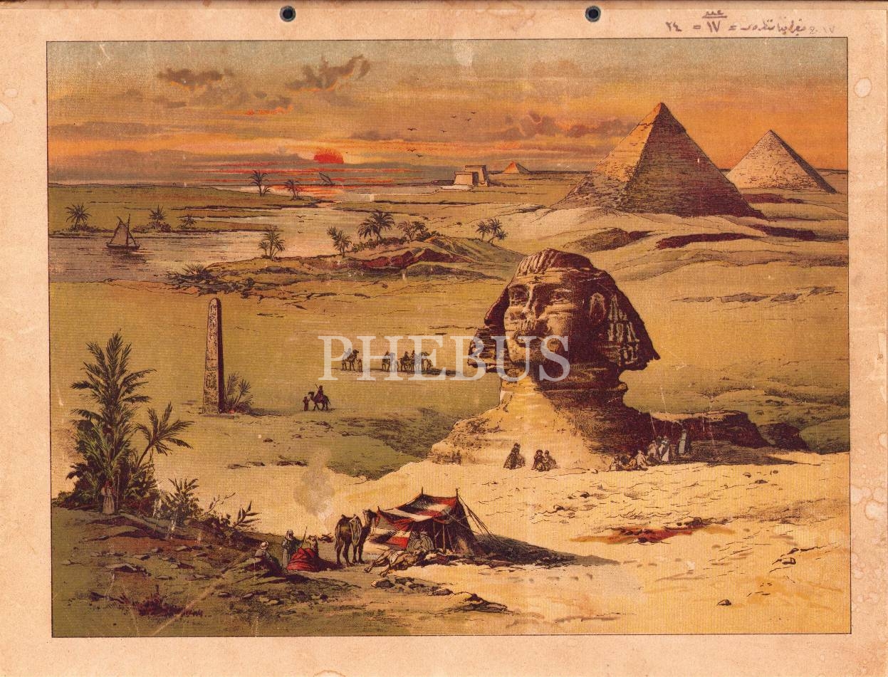 Osmanlıca "Coğrafya Manzarası": Giza Çölü, Büyük Sfenks ve Piramitler, kitaptan çıkma ve kartona yapışık, 31x41 cm, su görmüş haliyle