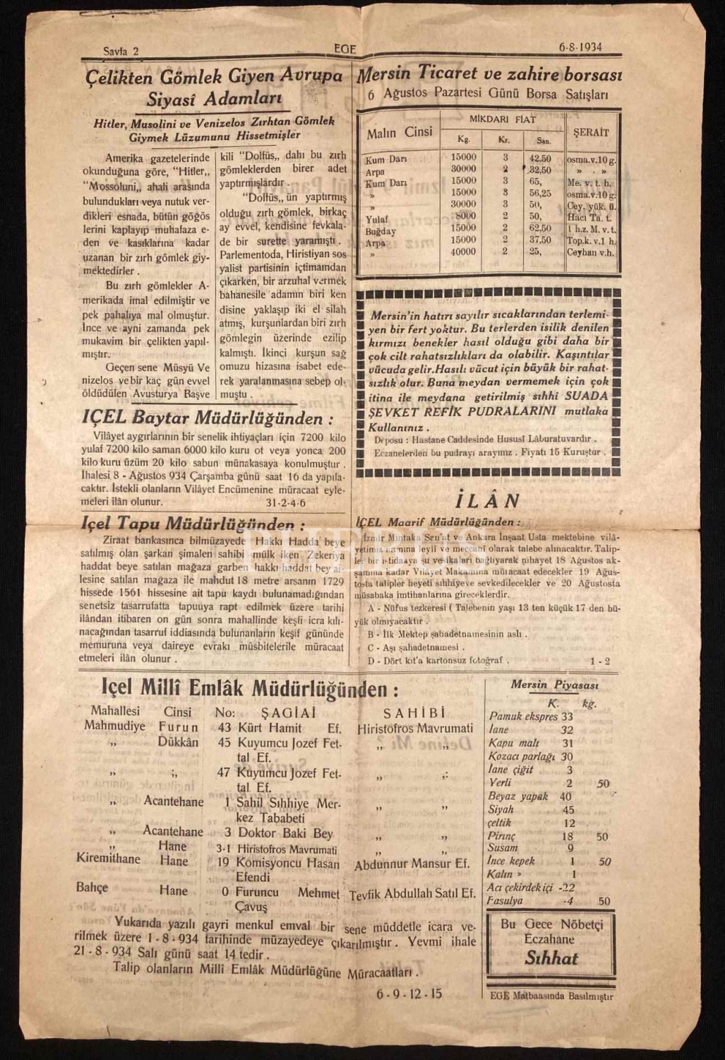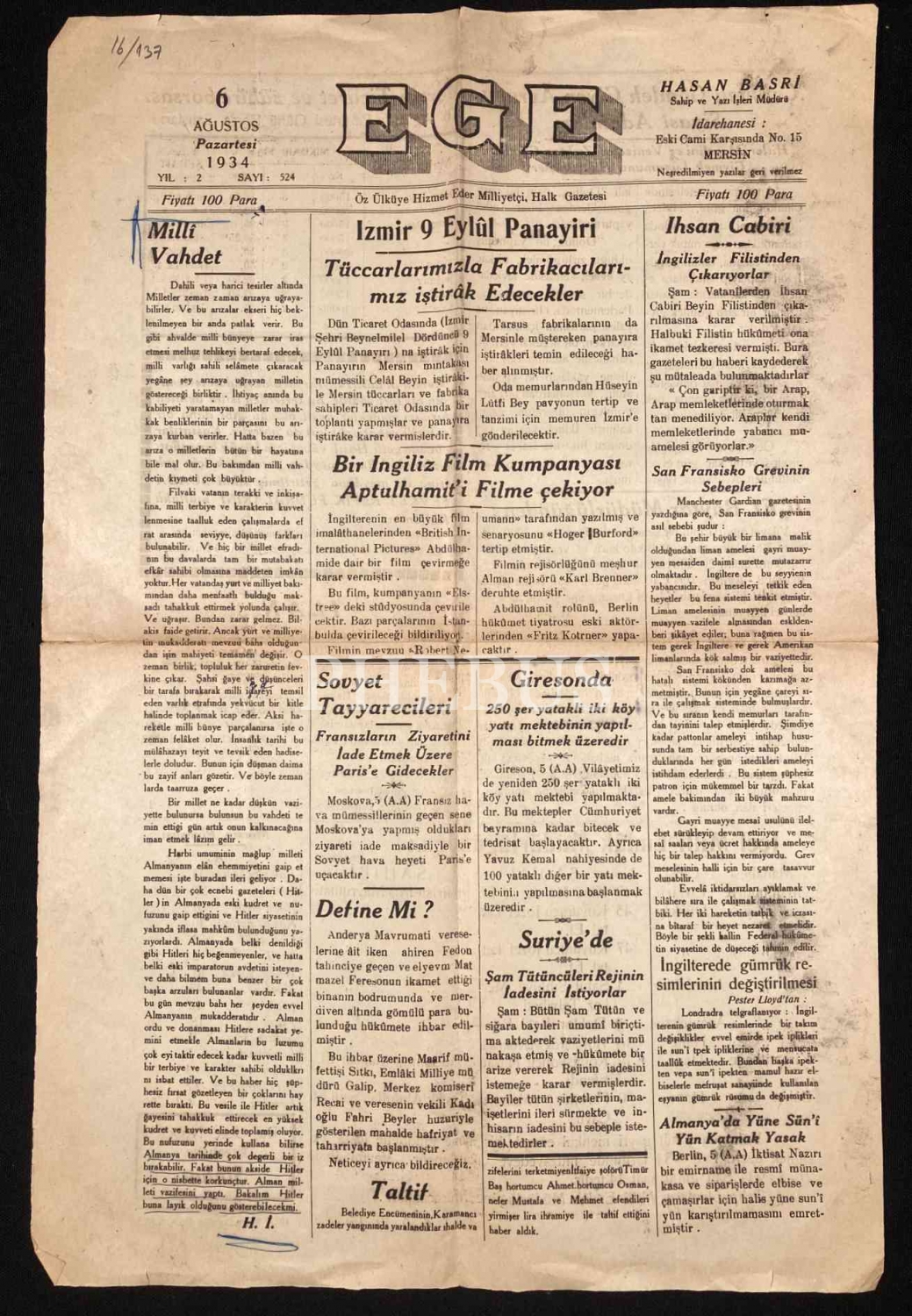 Ege gazetesi 524. sayı, 6 Ağustos 1934, tek yaprak, 31x47 cm, bir kenarı yırtık haliyle