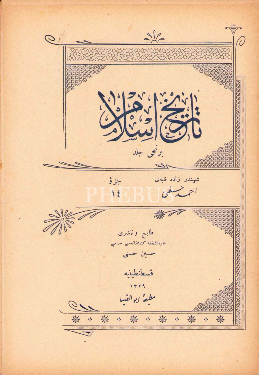 Osmanlıca Târîh-i İslâm 1. Cilt 14. Kısım, Şehbenderzâde Filibeli Ahmed Hilmi, Ebuzziya Matbaası, Kostantiniyye [İstanbul] 1329, 16 s., 14x21 cm, kenarları yıpranmış haliyle