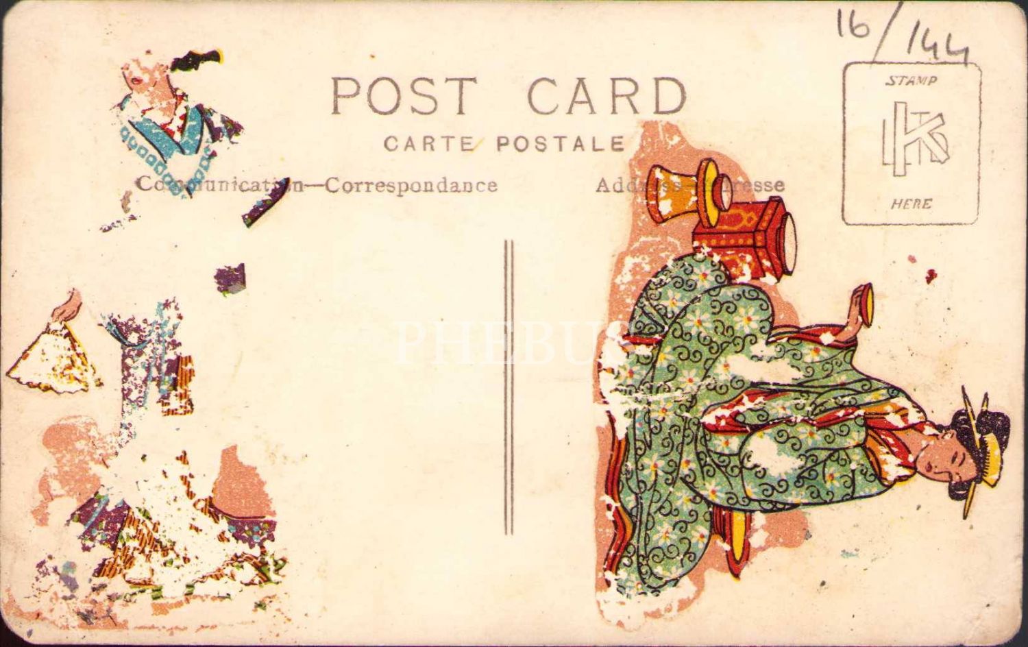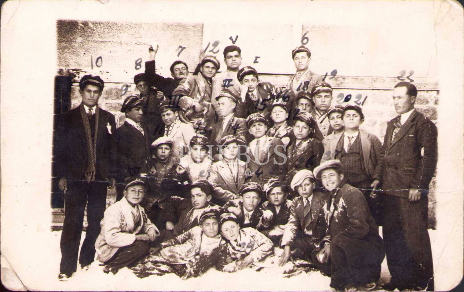 Okulda toplu hatıra fotoğrafı, arka yüzünde kimonolu kadın dövmesi mevcut, yıpranmış haliyle