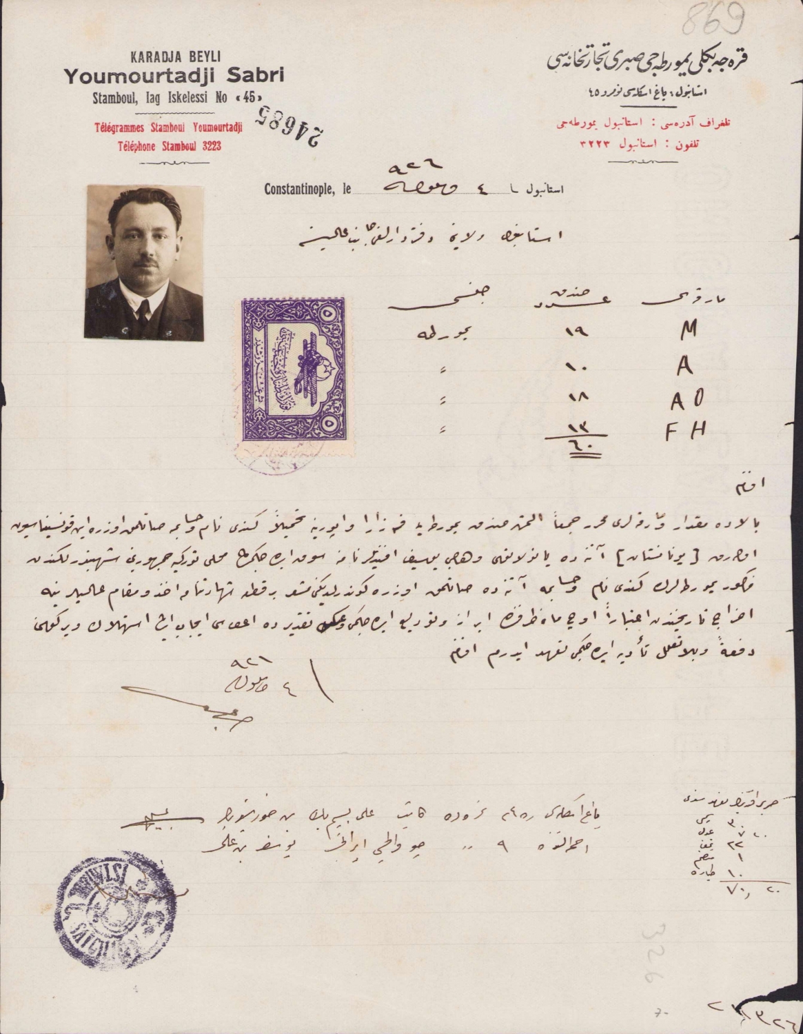 Osmanlı Karacabeyli Yumurtacı Sabri Tİcarethanesi antetli işyeri dokümanı, iki dilde, pullu, damgalı, 22x30cm