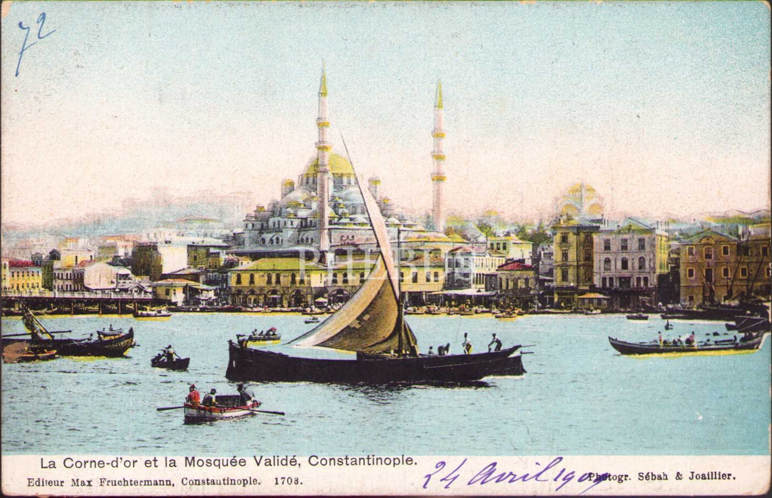 Haliç ve Valide Camii, Constantinople, ed. Max Fruchtermann, fotoğraf: Sebah&Joaillier, kenarları hafif soyulmuş haliyle