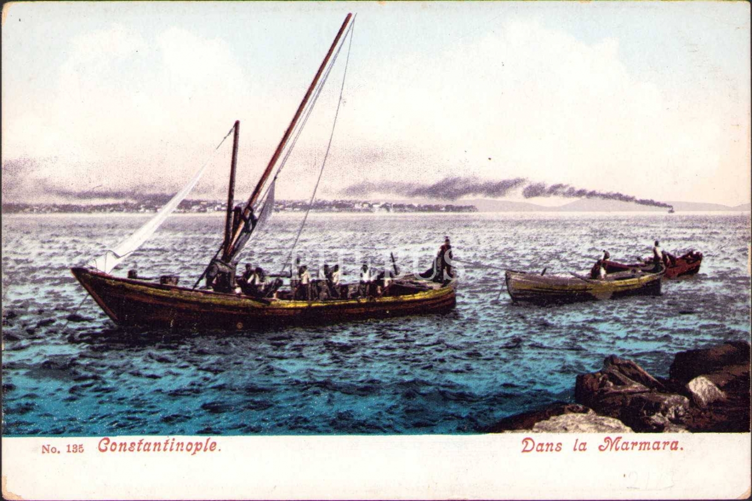 Marmara Denizi'nde kayıkçılar, Constantinople, arkası yazılı, köşeleri hafif soyulmuş haliyle