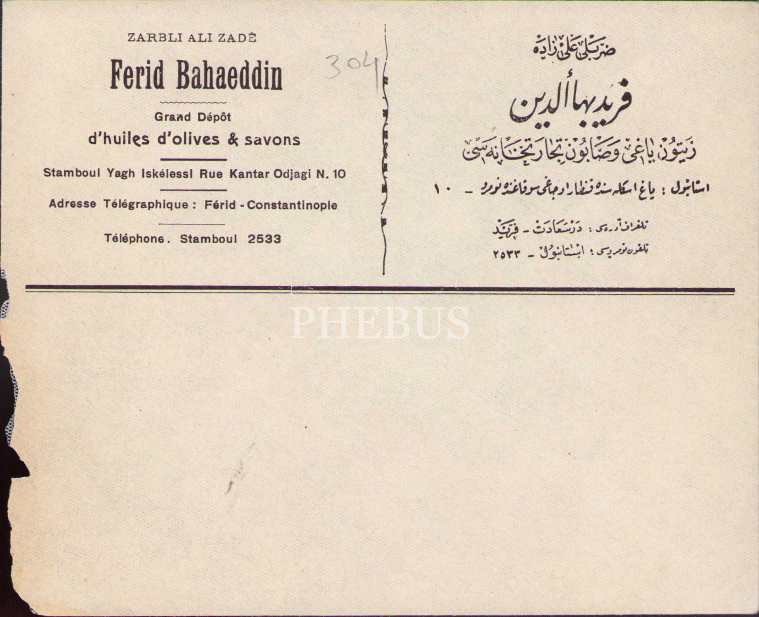 Osmanlıca-Fransızca Zarblızade Ferid Bahaeddin Zeytinyağı ve Sabun Ticarethanesi antetli zarf, 12x15 cm, bir kenarı yırtık haliyle
