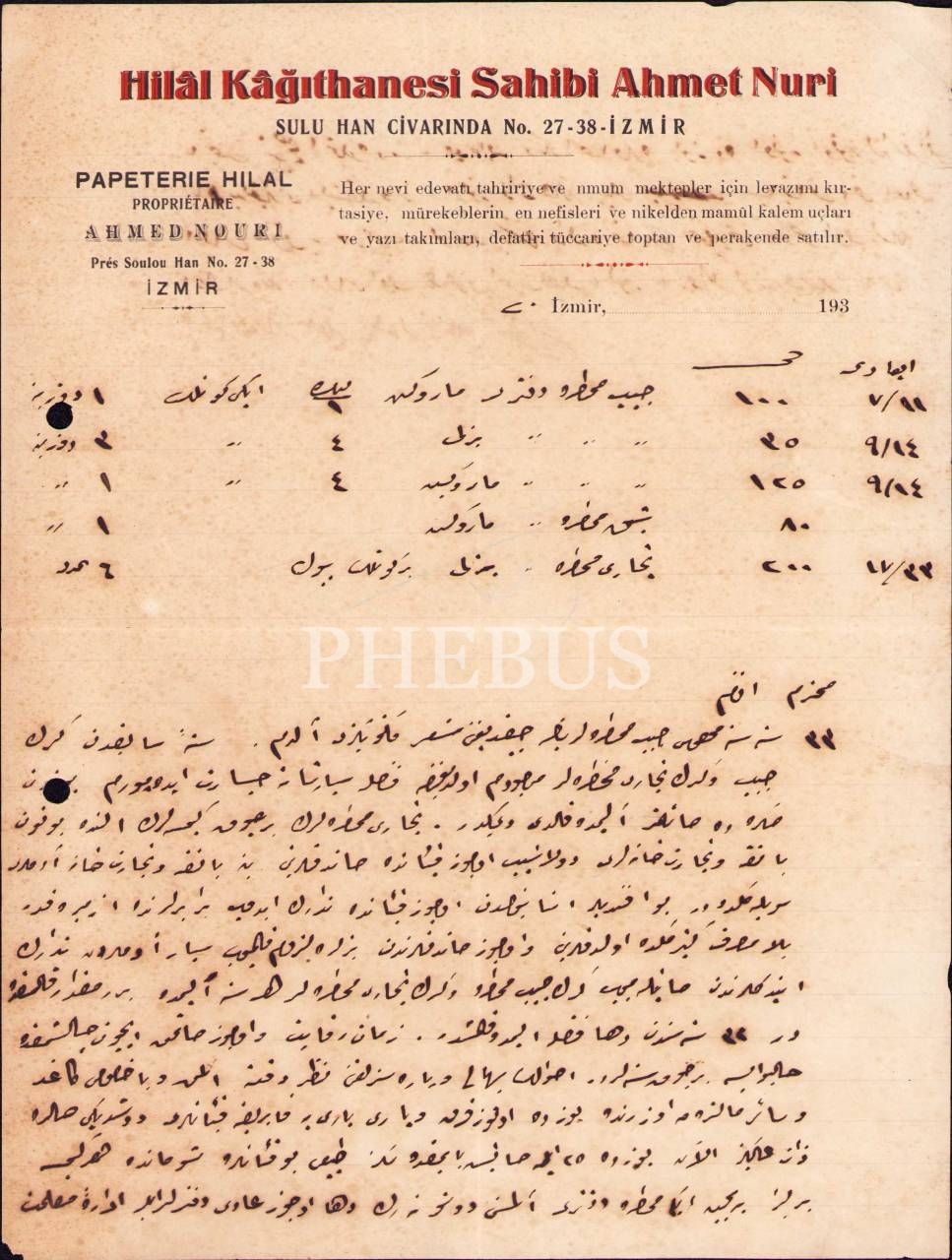 Hilâl Kâğıthanesi Sahibi Ahmet Nuri-İzmir antetli kâğıtta Osmanlıca mektup, 1932 tarihli, 20x27 cm, yorgun haliyle