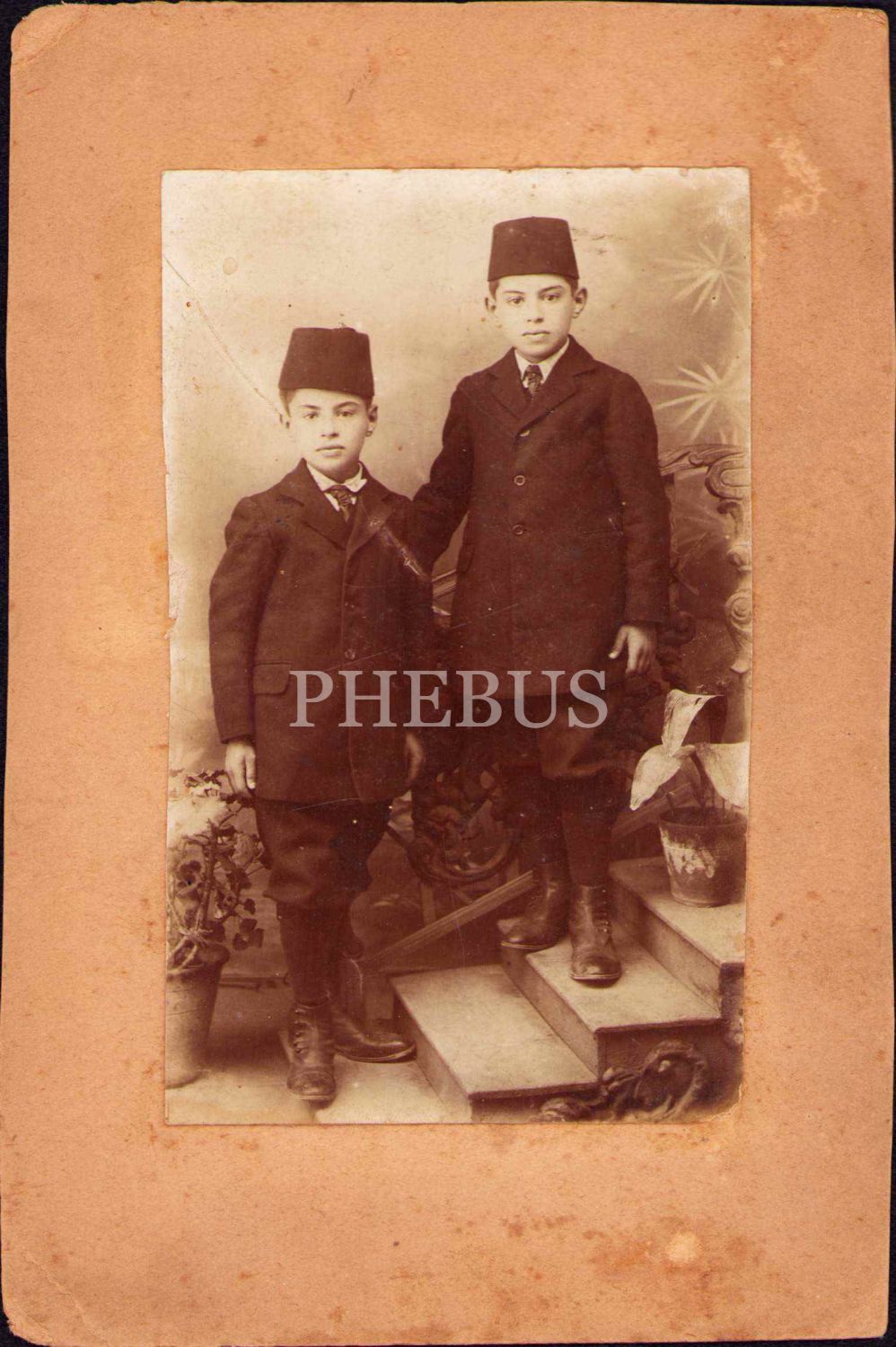 Fesli iki çocuğun hatıra fotoğrafı, kartona yapışık, foto: 8x14 cm, yıpranmış haliyle