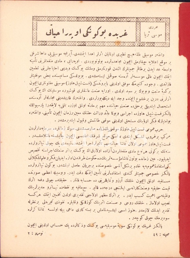 Türk bestekâr Rauf Yekta'ya ait "Dede Efendi" ve "Dârül-Elhânlar Tarihine Bir Nazar" makalelerinin yanı sıra "Garbda Bugünkü Opera Hayatı", "Rus Musikisine Bir Nazar" vd. başlıklı yazıları içermektedir.