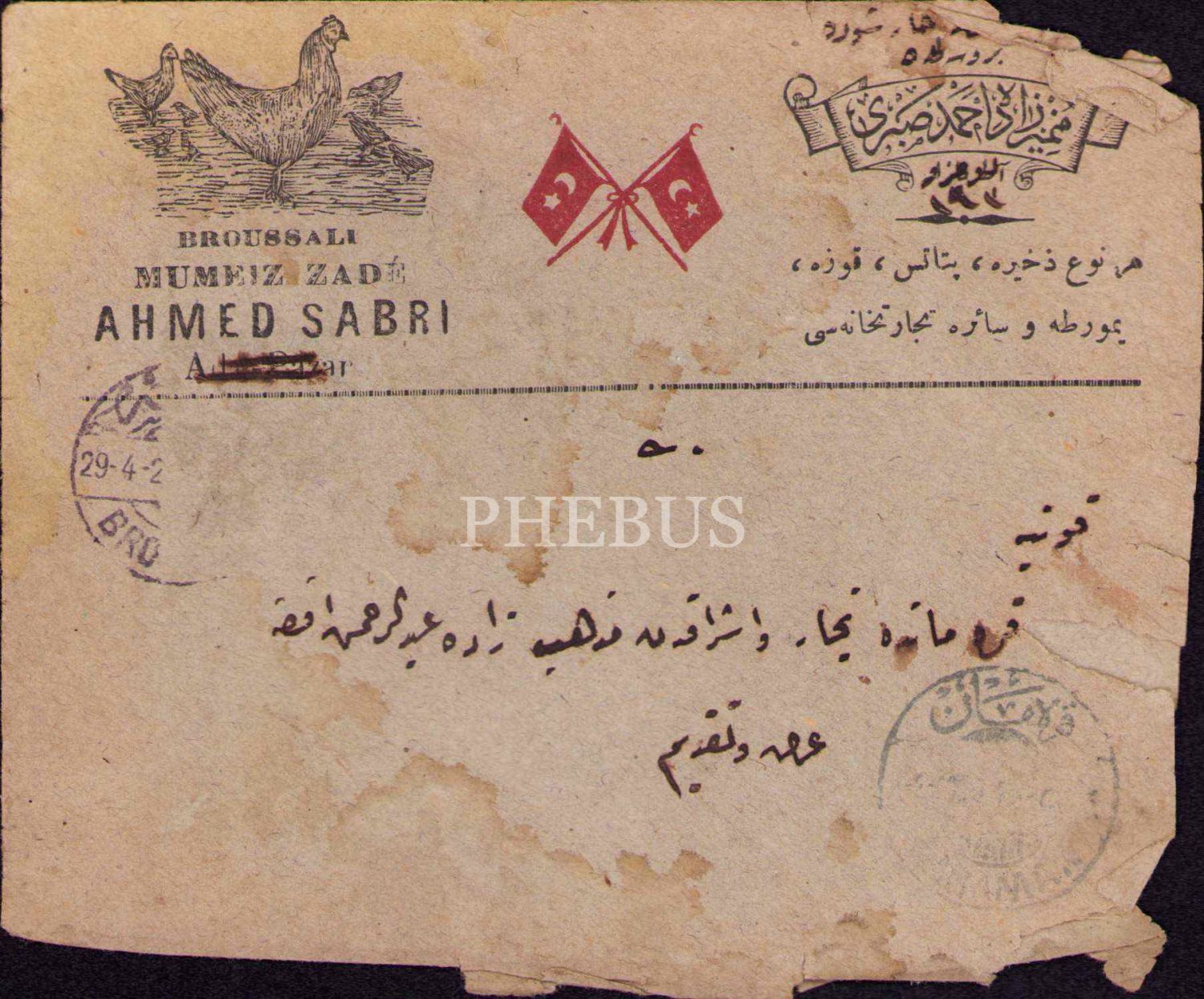 Osmanlıca-Fransızca Bursalı Mümeyyizzade Ahmed Sabri antetli zarf, Karaman'da Müzehhipzade Abdurrahman Efendi'ye gönderilmiş, 12x15 cm, epey yıpranmış haliyle