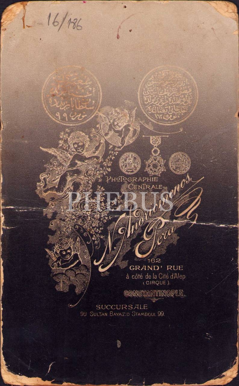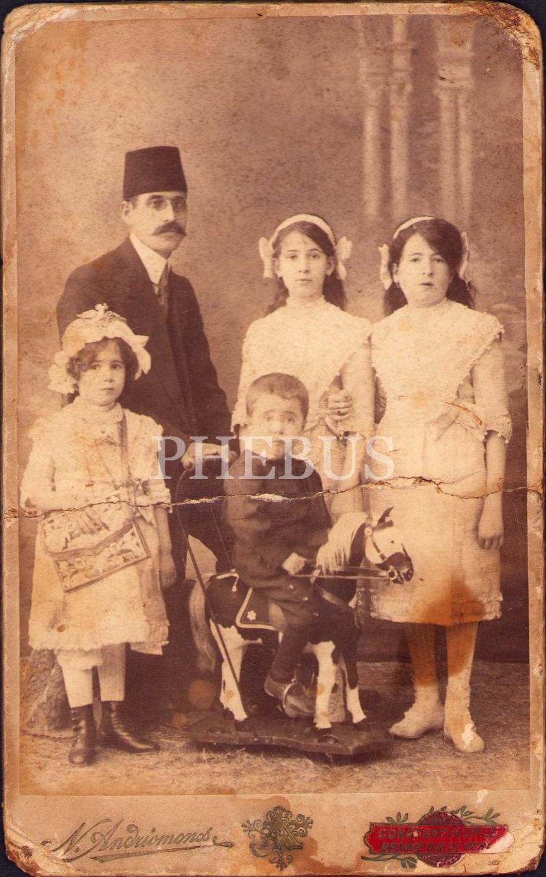 Fesli beyefendi ve çocukların kabin fotoğrafı, N. Andriomenos, Constantinople, 13x21 cm, epey yıpranmış haliyle