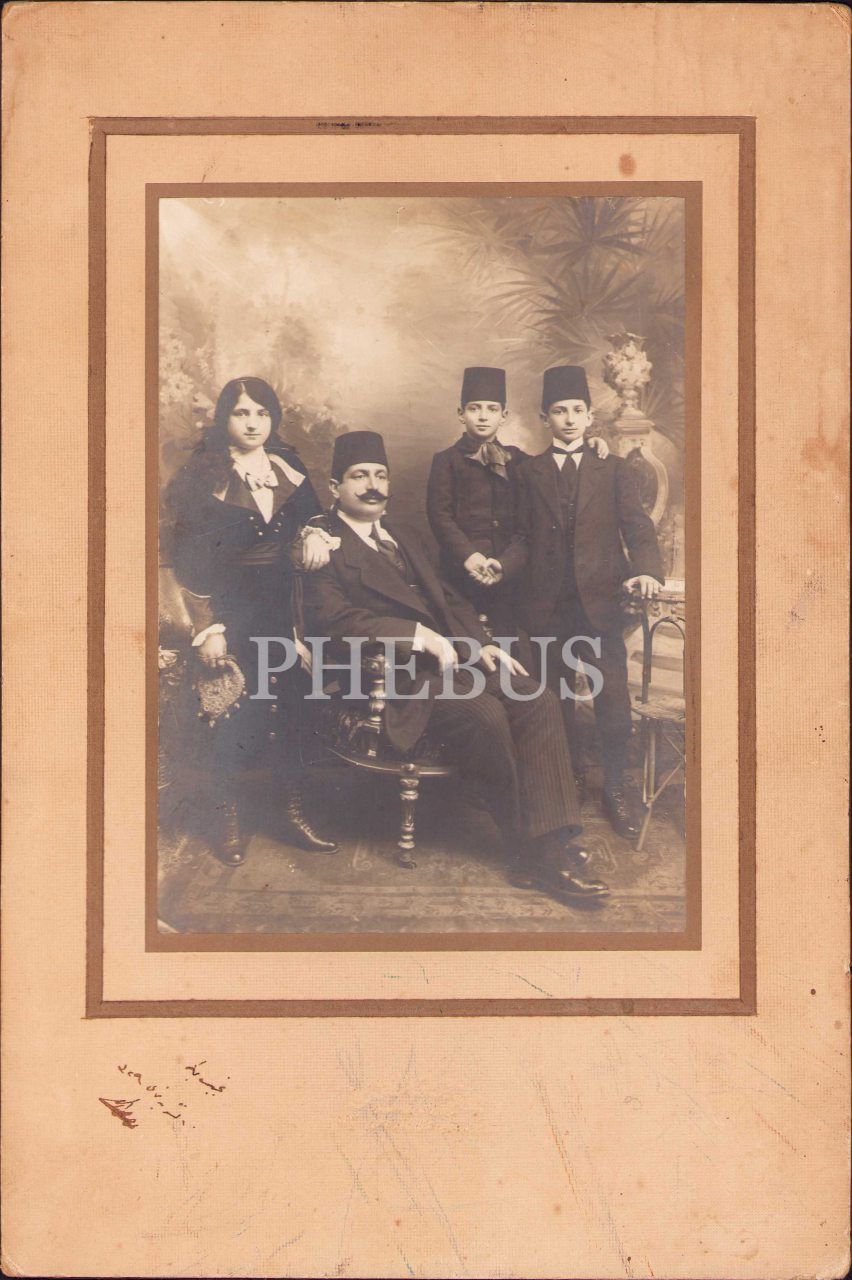 Fesli beyefendi ve çocukların yer aldığı aile hatıra fotoğrafı, 1329 tarihli Osmanlıca ithaf mevcut, Osmanlıca fotoğrafhane damgalı, foto: 12x17 cm, paspartusu yıpranmış haliyle